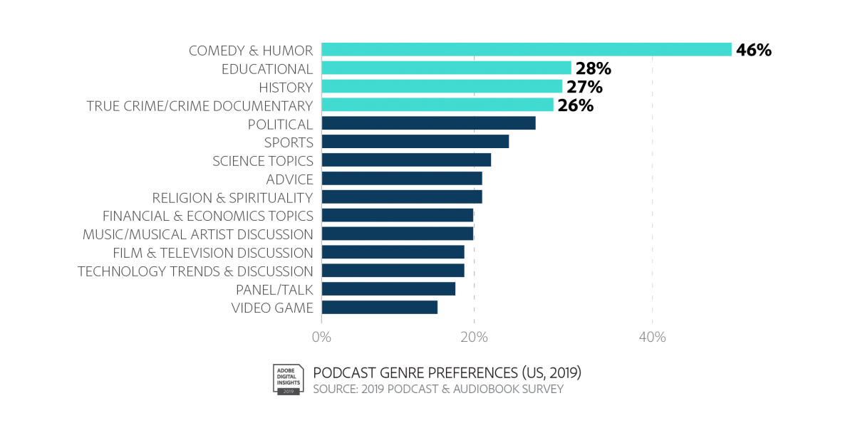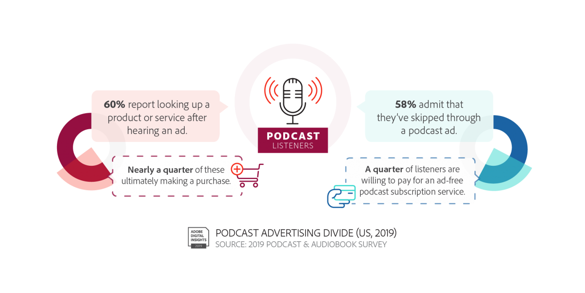 รายงานข้อมูลล่าสุดจาก Adobe Analytics เผย คนชื่นชอบคอนเทนท์และหันไปฟัง Podcast เพิ่มมากขึ้น รายงานดังกล่าวซึ่งอ้างอิงผลสำรวจความคิดเห็นของชาวสหรัฐฯ จำนวน 1,008 คน สะท้อนพฤติกรรมการฟังออดิโอสตรีมมิ่งของผู้ฟัง Podcast รวมไปถึงข้อมูล Comscore ของผู้ใช้งานโมบายล์แอปในสหรัฐฯ 193 ล้านคนต่อเดือน ในช่วงตั้งแต่เดือนมกราคม 2018 ถึงพฤษภาคม 2019