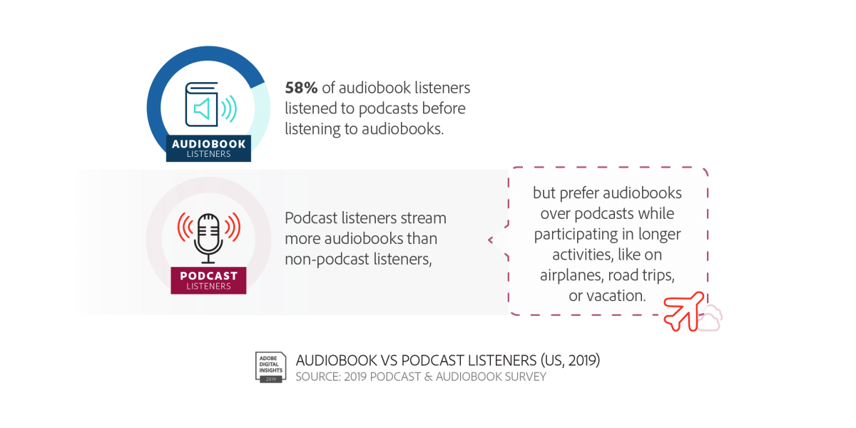 นอกเหนือจากการตรวจสอบแนวโน้มของการฟัง Podcast แล้ว Adobe Analytics ยังสำรวจการฟังออดิโอบุ๊ค พบชี้ว่า มีประเด็นที่น่าสนใจหลายประการ คือ ผู้ฟัง Podcast ระบุว่า ตนเองสตรีมออดิโอบุ๊คมากกว่าที่ผู้ไม่ได้ฟัง Podcast แต่ชอบออดิโอบุ๊คมากกว่าพอดคาสต์ขณะที่ทำกิจกรรมที่ใช้เวลานาน เช่น อยู่บนเครื่องบิน ขณะเดินทางด้วยรถยนต์ หรือช่วงวันหยุดพักร้อน