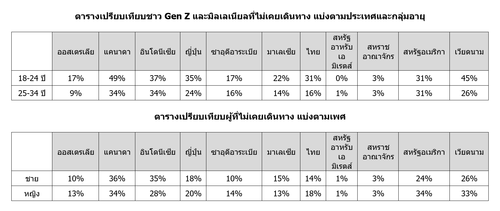 โดยรวมแล้ว มีผู้หญิง 19% ที่ไม่เคยเดินทางออกนอกประเทศบ้านเกิดขณะที่ผู้ชายมีสัดส่วนคิดเป็น 17% มีเพียงสหรัฐอเมริกา เวียดนาม และอินโดนีเซียเท่านั้นที่มีสัดส่วนนักเดินทางเพศชายและหญิงที่แตกต่างกันอย่างชัดเจน