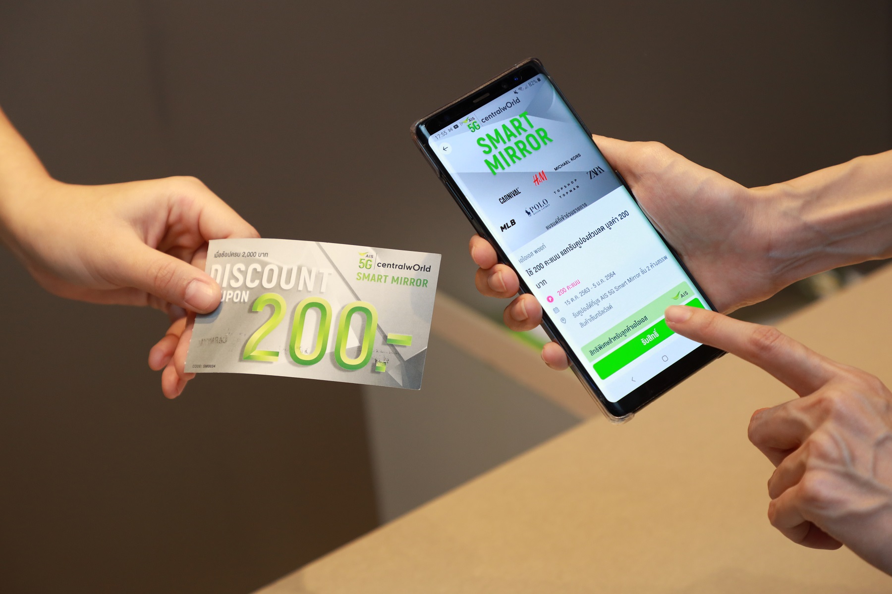 และเพื่อเปิดประสบการณ์ใหม่ให้ลูกค้าได้สัมผัสความเร็วแรงของเทคโนโลยี 5G ที่เหนือระดับไปอีกขั้น จึงมอบสิทธิพิเศษให้ลูกค้าเอไอเอส ที่ไปลองเสื้อผ้าที่บูธ AIS 5G SMART MIRROR ตั้งแต่วันนี้ - 5 มกราคม 2564 ณ ชั้น 2 โซนเซ็นทรัลคอร์ท หน้าลิฟต์แก้ว ศูนย์การค้าเซ็นทรัลเวิลด์ ประกอบด้วย