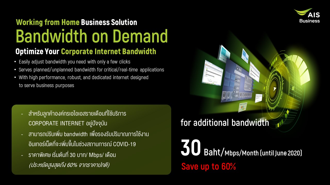 • Corporate Internet Bandwidth on Demand ให้ลูกค้าสามารถปรับสปีดการใช้งาน อินเทอร์เน็ตองค์กร หรือเครือข่ายส่วนตัวขององค์กร (DDC MPLS) ได้ตามความต้องการ โดยจัดราคาพิเศษในช่วงนี้ สำหรับ bandwidth ที่เพิ่มขึ้น เพียง 30 บาท/Mbps/เดือน สมัครได้ตั้งแต่ วันนี้ - 30 มิถุนายน 2563