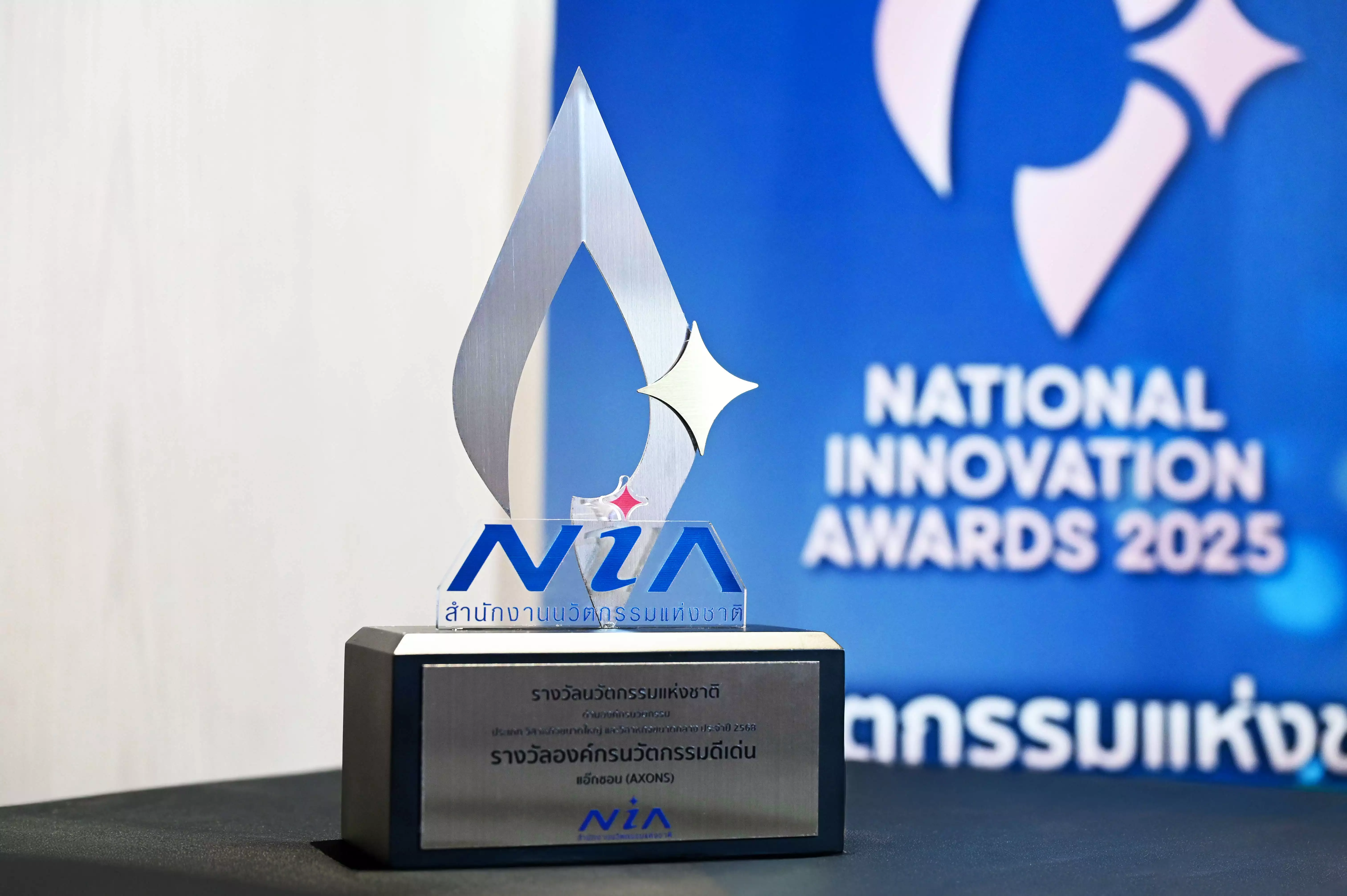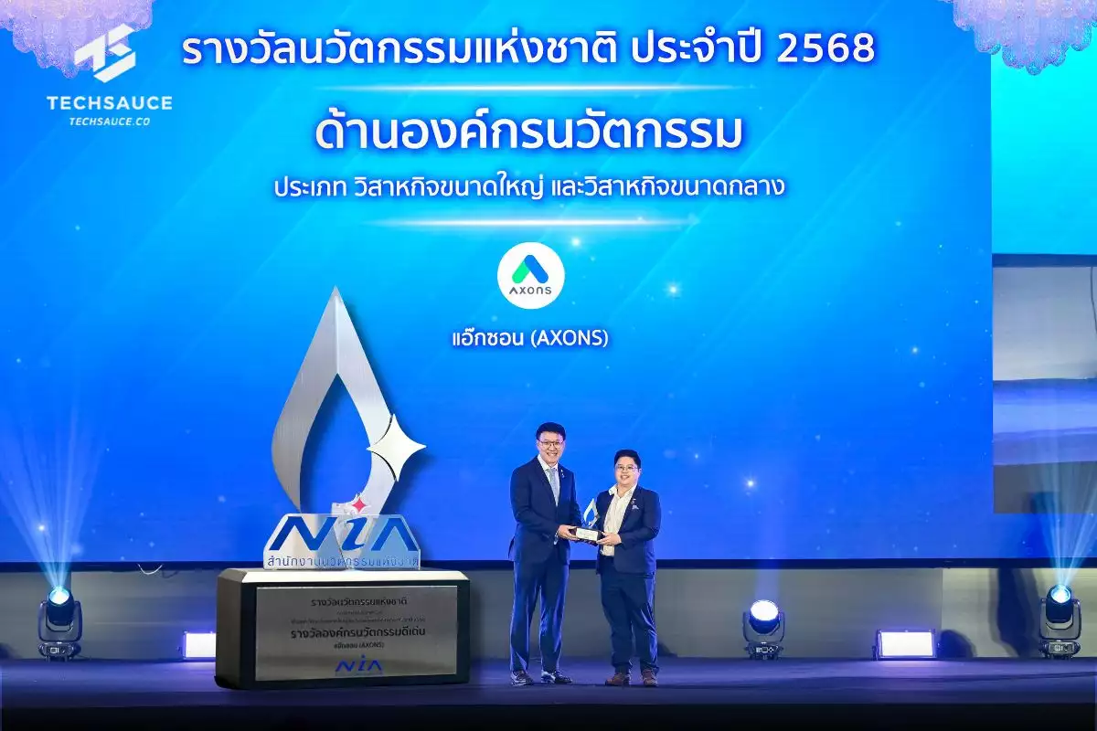 นายสรรเสริญ สมัยสุต กรรมการผู้จัดการแบรนด์แอ๊กซอน (AXONS) รับโล่รางวัลองค์กรนวัตกรรมดีเด่น ประเภทวิสาหกิจขนาดใหญ่ และวิสาหกิจขนาดกลาง จาก ดร.กริชผกา บุญเฟื่อง ผู้อำนวยการสำนักงานนวัตกรรมแห่งชาติ ในพิธีมอบรางวัลนวัตกรรมแห่งชาติ ประจำปี 2568 จัดโดยสำนักงานนวัตกรรมแห่งชาติ (องค์การมหาชน) หรือ NIA เพื่อยกย่องเกียรติแก่องค์กรและคนไทยที่ริเริ่มสร้างสรรค์ผลงานที่มีความเป็นนวัตกรรมโดดเด่นสร้างการเติบโตอย่างยั่งยืนให้แก่องค์กร สังคมและประเทศชาติ