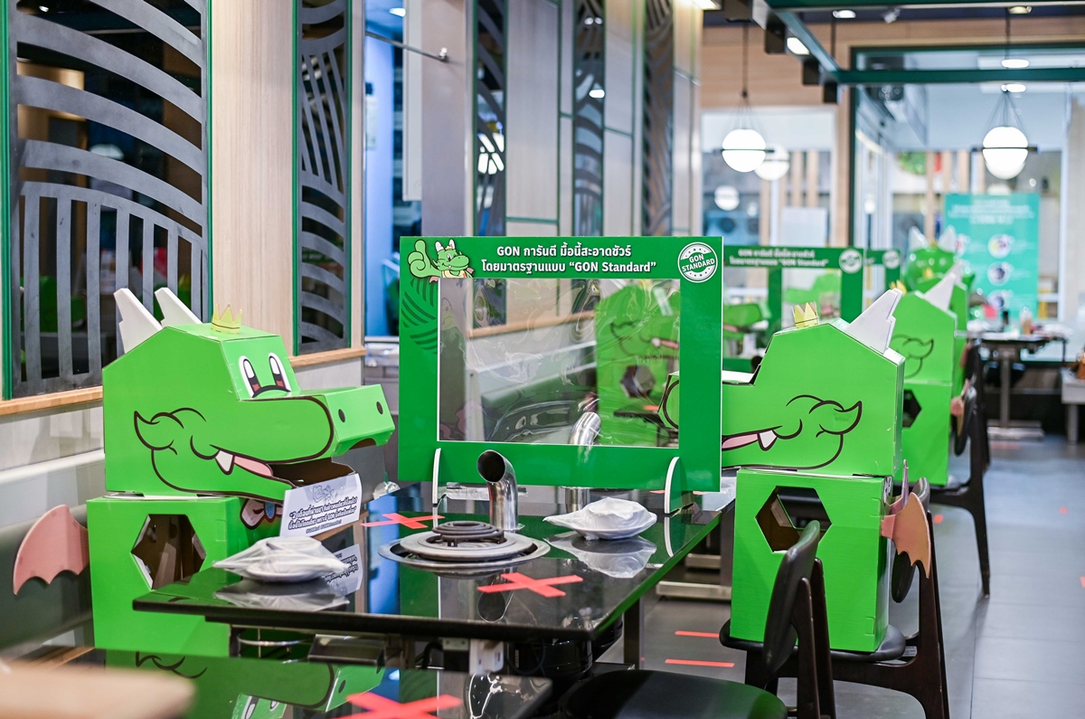 เราจึงได้พัฒนามาตรการที่เข้มข้นเฉพาะขึ้นอีก เรียกว่า GON Standard เป็น 5 มาตรการสำคัญที่รวมข้อปฏิบัติเพื่อความปลอดภัยถึง 20 ขั้นตอน ที่จะทำให้ทุกคนปลอดภัยตั้งแต่เดินเข้าร้าน นั่งทานในร้าน ตลอดจนกระทั่งเดินออกจากร้าน เช่น การตรวจวัดอุณหภูมิพนักงานถึง 2 รอบต่อวัน การเว้นระยะห่างในการเสิร์ฟอาหาร 30 เซ็นติเมตร หรือแม้แต่การจัด ‘GON ชั่วโมงสะอาด’ ที่เรายอมสูญเสียโอกาสการขายไป 1 ชั่วโมง เพื่อทำความสะอาดพร้อมกันทุกสาขาทั่วประเทศ เพื่อให้ลูกค้ามั่นใจในความปลอดภัยของเรา และนอกเหนือจากปัจจัยด้านความปลอดภัยแล้ว อีกแง่มุมที่เราให้ความสำคัญเช่นกันก็คือประสบการณ์ความสุขและความสนุกจากการรับประทานอาหารที่ร้าน