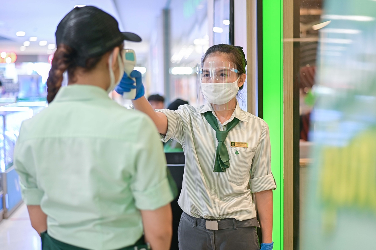 2. ตรวจวัดอุณหภูมิพนักงาน 2 รอบต่อวัน (ก่อนเข้าทำงานและเวลา 16.00 น.) โดยแสดงอุณหภูมิบนป้ายชื่อทุกคน