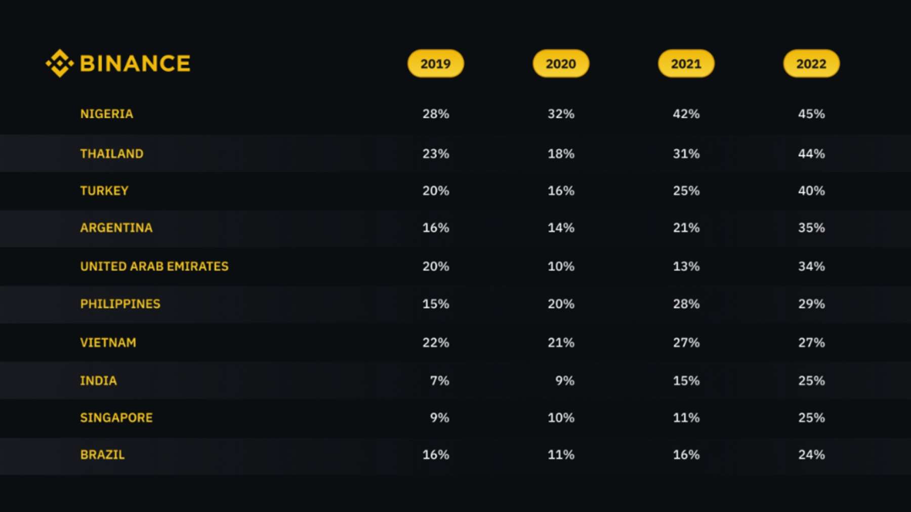 ถึงแม้ว่าตลาดคริปโตจะเผชิญกับความท้าทายและปัญหาที่ส่งผลกระทบต่อบรรยากาศโดยรวม แต่การใช้งานคริปโตทั่วโลกยังคงขยายตัวอย่างต่อเนื่อง ทั้งในระดับผู้ใช้รายย่อยและองค์กรต่างๆ ที่เริ่มนำเครื่องมือและบริการบล็อกเชนมาปรับใช้ โดยตัวเลขจากผู้ตอบแบบสอบถามของ Statista เผยว่า ปีที่ผ่านมาการครอบครองและใช้งานคริปโตยังคงเติบโตอย่างต่อเนื่องใน 56 ประเทศหลักที่มีการสำรวจเมื่อเทียบกับปี 2021 ซึ่งประเทศไทยถือเป็นประเทศที่มีการครอบครองและใช้งานคริปโตกว่า 44% ซึ่งถือเป็นอันดับ 2 รองจากประเทศไนจีเรีย นับว่าอัตราการเติบโตที่สูงเกือบเท่าตัวเมื่อเทียบกับปี 2019 ซึ่งผลสำรวจดังกล่าวตรงกับรายงานของ Hootsuite แพลตฟอร์มเครื่องมือจัดการโซเชียลมีเดียระดับโลก ที่ชี้ให้เห็นว่าประเทศไทยติด 5 อันดับแรกของจำนวนผู้ใช้งานอินเทอร์เน็ตที่ถือครองคริปโตในกลุ่มอายุ 16 - 64 ปี โดยยังมีการคาดการณ์ว่าภายในปี 2027 จำนวนผู้ถือครองคริปโตในประเทศไทยมีแนวโน้มที่จะเพิ่มสูงถึง 5.12 ล้านคนเลยทีเดียว