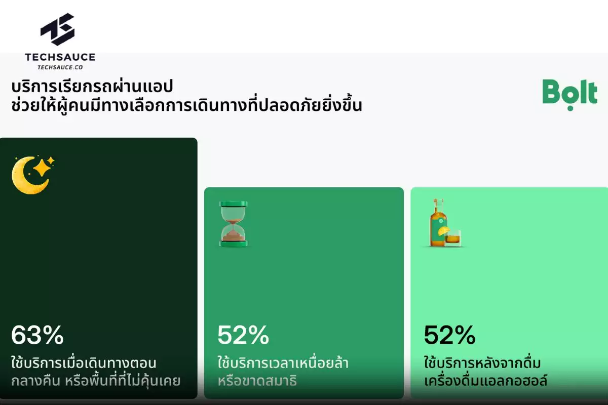 ผลสำรวจ Night-Time Mobility Survey โดย โบลท์ (Bolt) ร่วมกับ IPSOS พบว่า 60% ของผู้ใช้ชาวไทย ใช้บริการเรียกรถผ่านแอปฯ สัปดาห์ละครั้งหรือมากกว่า และกว่า 21% ใช้งานเป็นประจำทุกวัน สะท้อนให้เห็นว่าบริการดังกล่าวไม่ได้เป็นเพียงทางเลือกด้านความสะดวกสบายเท่านั้น แต่กลายเป็นโครงสร้างพื้นฐานสำคัญในการเดินทางที่ตอบโจทย์วิถีชีวิตของคนกรุงเทพฯและในเมืองใหญ่ทั่วประเทศ
