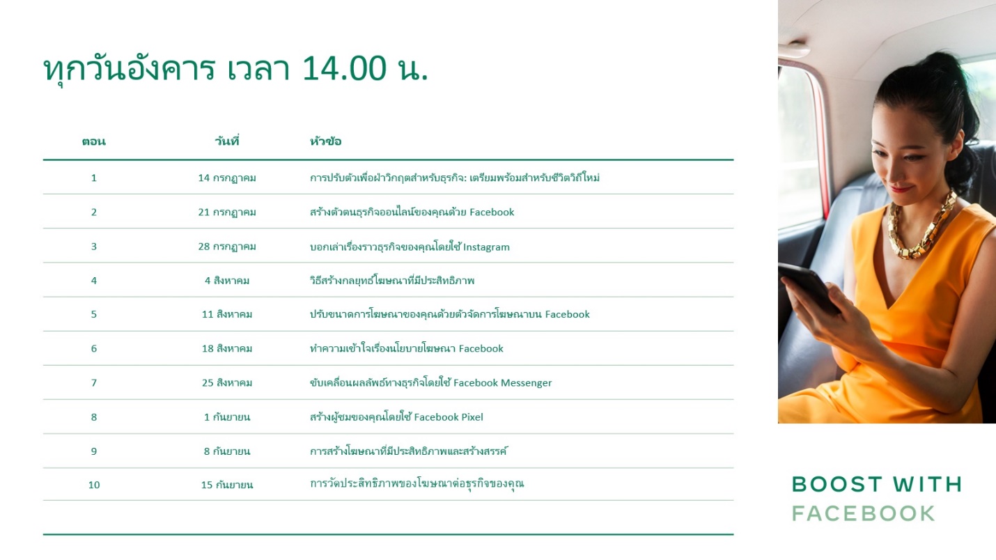 Facebook ประเทศไทย เปิดตัวหลักสูตรฝึกอบรมออนไลน์โดยไม่มีค่าใช้จ่าย ภายใต้โครงการ Boost with Facebook เพื่อเสริมทักษะดิจิทัลแก่ธุรกิจขนาดกลางและขนาดย่อมของไทย ในขณะที่กลุ่มชุมชนของธุรกิจท้องถิ่นเริ่มกลับมาดำเนินการอีกครั้ง โดยหลักสูตรการฝึกอบรมออนไลน์ Boost with Facebook จะเปิดอบรมแก่ผู้ประกอบการขนาดเล็กบุคคลทั่วไปด้วยหลักสูตรเรียนรู้ทั้งหมด 10 ตอน ออกอากาศผ่านเพจ Facebook for Business เป็นภาษาไทยในระหว่างวันที่ 14 กรกฎาคม – 15 กันยายน พ.ศ. 2563