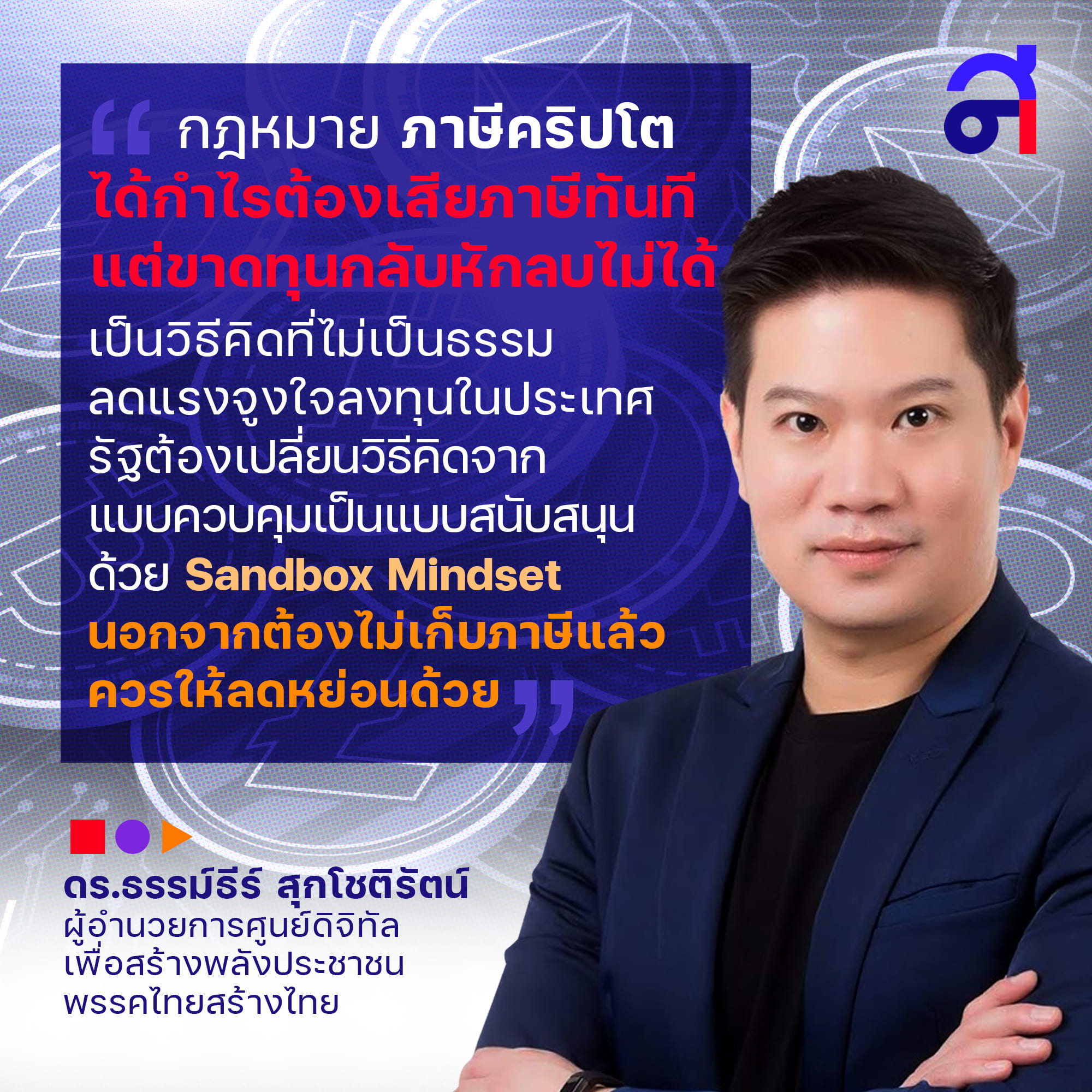 ดร.ธรรม์ธีร์ สุกโชติรัตน์ ผู้อำนวยการศูนย์ดิจิทัลเพื่อสร้างพลังของประชาชน พรรคไทยสร้างไทย กล่าวถึงกรณีกรมสรรพากร ออกมาชี้แจงประเด็น “ภาษีคริปโต” ตามพระราชกำหนดแก้ไขเพิ่มเติมประมวลรัษฎากร (ฉบับที่ 19) พ.ศ. 2561 ว่าตามกฎหมายที่บังคับใช้ในปัจจุบันสำหรับนักลงทุน มีการจัดเก็บภาษีในระดับ "ธุรกรรม" กล่าวคือเมื่อทำรายการแล้วได้กำไรต้องเสียภาษีทันที แต่เมื่อทำรายการแล้วขาดทุนกลับไม่มีการนำมาหักลบจากจำนวนภาษีที่ต้องเสีย ซึ่งเป็นแนวปฏิบัติที่ไม่เป็นธรรมต่อนักลงทุน ไม่ทันต่อยุคสมัย ซึ่งต่างประเทศที่สนับสนุนให้มีการลงทุนเกิดขึ้นภายในประเทศจะไม่ใช้วิธีคิดแบบนี้