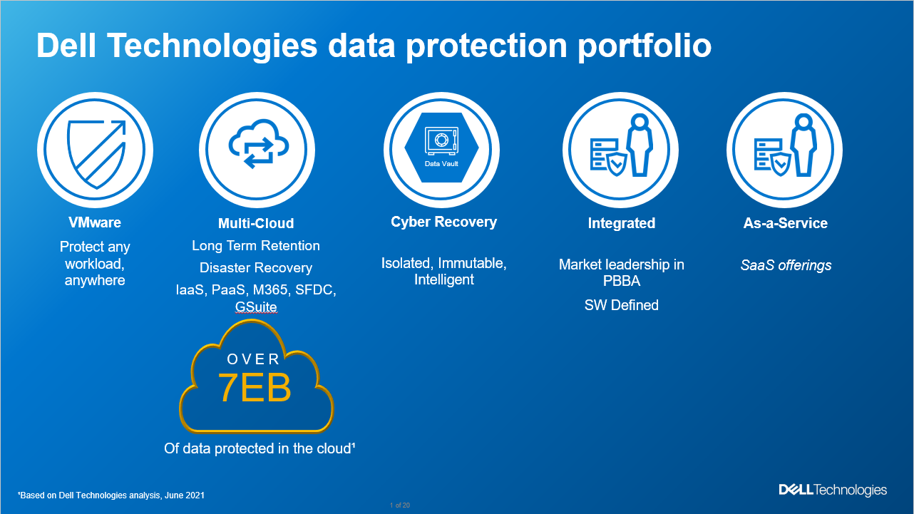 เดลล์ เทคโนโลยีส์ กำลังตอบโจทย์ภาพรวมด้านไอทีที่ล้ำหน้ายิ่งขึ้นด้วยโซลูชันที่ช่วยองค์กรปกป้องเวิร์กโหลดทั้งแบบดั้งเดิมและเวิร์กโหลดสมัยใหม่ด้วยแนวทางเดียวกัน เดลล์ ซึ่งเป็นผู้นำด้านการปกป้องข้อมูลแบบมัลติคลาวด์ ช่วยปกป้องข้อมูลขนาด 7 เอ็กซาไบต์ครอบคลุมผู้ให้บริการพับบลิคคลาวด์รายหลักทั้งหมด ด้วยการคิดค้นนวัตกรรมอย่างต่อเนื่อง และการออกแบบวิศวกรรมที่คล่องตัว รวมถึงการผสานรวมเข้ากับ VMware และผู้นำอุตสาหกรรมอื่นๆ ได้อย่างแน่นแฟ้น ทำให้เดลล์ ยังคงเป็นผู้ให้บริการชั้นนำด้านอุปกรณ์และซอฟต์แวร์เพื่อการปกป้องข้อมูลทั่วโลก เดลล์ได้นำเสนอหนึ่งในสายผลิตภัณฑ์ที่สมบูรณ์แบบและครบวงจรมากที่สุดในอุตสาหกรรมเพื่อการสร้างความยืดหยุ่นในการรับมือทางไซเบอร์ที่เอดจ์ และโครงสร้างหลักของดาต้าเซ็นเตอร์ รวมถึงสภาพแวดล้อมแบบมัลติคลาวด์ ด้วยการมอบโซลูชันเช่น Dell EMC PowerProtect Cyber Recovery และ Dell EMC PowerScale พร้อม Superna Eyeglass Ransomware Defender