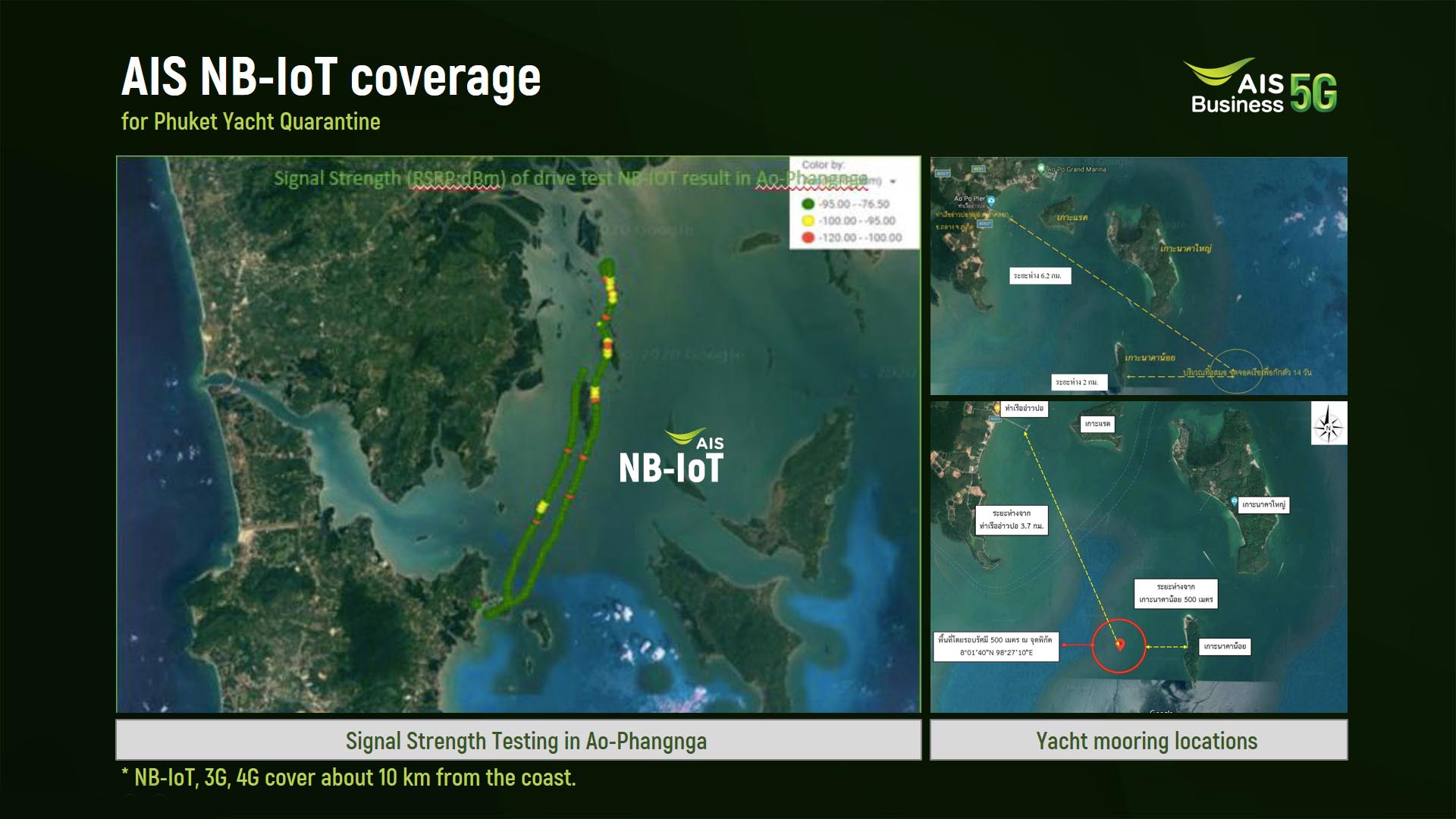 ในช่วงที่ผ่านมากับ “โครงการ AIS5G สู้ภัยโควิด” ที่ได้นำศักยภาพของโครงข่ายไปใช้ในพื้นที่กักตัวและโรงพยาบาลสนามหลักหลายแห่ง อาทิ โรงพยาบาลธรรมศาสตร์เฉลิมพระเกียรติ ,ศูนย์ห่วงใยคนสาคร, ฯลฯ ซึ่งล่าสุดกับ “โครงการกักตัววิถีใหม่บนเรือยอชต์-Digital Yacht Quarantine ครั้งแรกในไทย ด้วยศักยภาพโครงข่าย AIS NB- IoT และนวัตกรรมสายรัดข้อมือติดตามสุขภาพอัจฉริยะ” (NB-IoT Wristband Tourist Tracking)” ที่เป็นรูปแบบการกักตัวนักท่องเที่ยวบนเรือยอชต์กลางทะเลก่อนเดินทางขึ้นบก เราจึงเลือกใช้เครือข่าย Narrow Band IoT ที่รองรับการเชื่อมต่อกับอุปกรณ์ IoT บนคลื่น 900 MHz ที่สามารถกระจายสัญญาณออกไปในทะเลได้มากกว่า 10 กม.