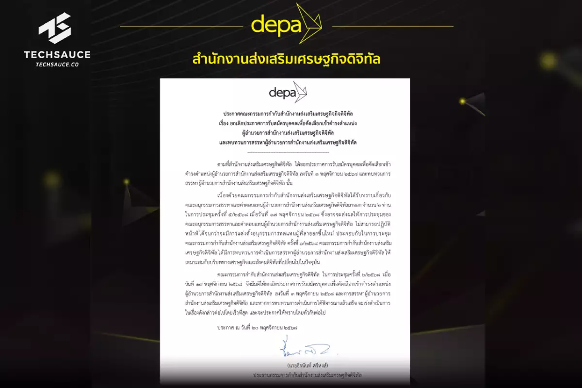วันที่ 20 พฤศจิกายน 2568, DEPA ยกเลิกประกาศการรับสมัครบุคคลเพื่อคัดเลือกเข้าดำรงตำแหน่งผู้อำนวยการสำนักงานฯ และทบทวนการดำเนินการสรรหา