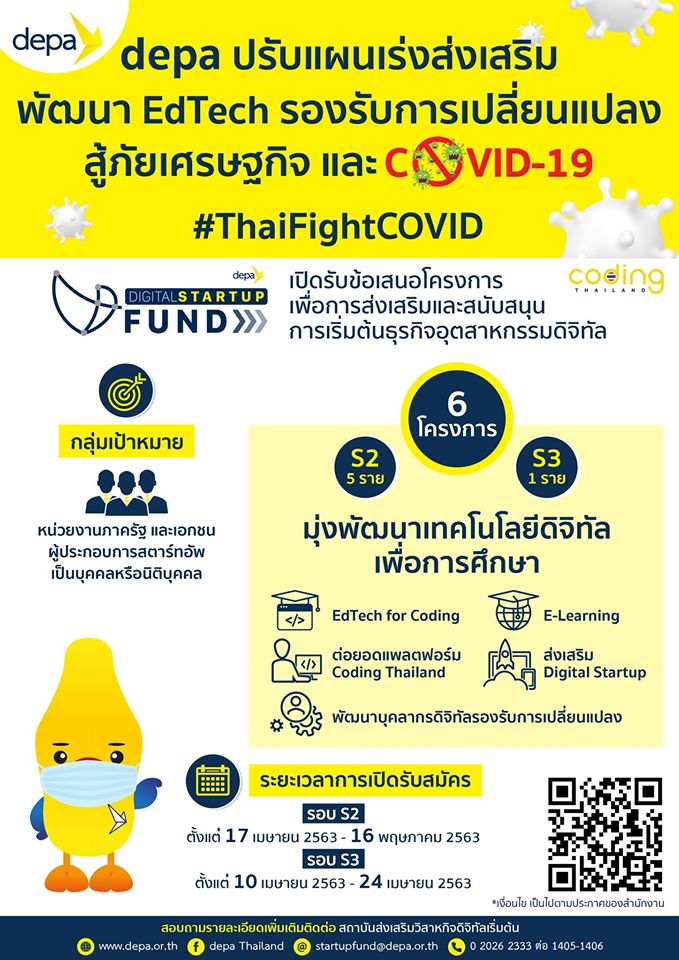 “มาตรการช่วยเหลือฯ ครั้งนี้จะมุ่งสนับสนุนดิจิทัลสตาร์ทอัพด้านเทคโนโลยีเพื่อการศึกษา เพื่อเข้ามาช่วยพัฒนาการเรียนการสอนด้านโค้ดดิ้งด้วยดิจิทัล เช่น การพัฒนาหลักสูตร e-Learning หรือ การพัฒนาบอร์ดสมองกลเสริมทักษะด้านโคดดิ้ง รองรับพฤติกรรมการเรียนการสอนที่อาจเปลี่ยนแปลงไป และช่วยผ่อนคลายความกังวลในเรื่องของสุขอนามัยของนักเรียน นักศึกษา ครูผู้สอน และผู้ปกครอง อันเนื่องมาจากวิกฤติ COVID-19 นอกจากนี้ มาตรการดังกล่าวจะเป็นอีกหนึ่งหนทางในการช่วยขยายโอกาสทางธุรกิจให้กับกลุ่มดิจิทัลสตาร์ทอัพด้านเทคโนโลยีเพื่อการศึกษา อีกทั้งเป็นตัวเร่งให้เกิดการเปลี่ยนแปลงเข้าสู่ยุคสังคมดิจิทัลของประเทศในอนาคต” ผู้อำนวยการใหญ่ ดีป้า กล่าว