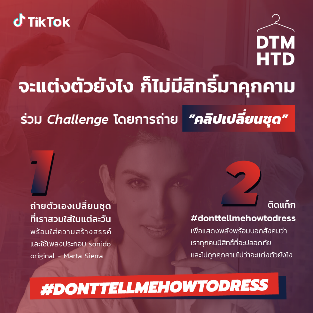 TikTok เดินหน้าให้ความสำคัญและส่งเสริมความเท่าเทียมกันทางสังคม เพื่อแสดงพลังแห่งการขับเคลื่อนสังคมความเสมอภาคโดยเฉพาะในเรื่องการแต่งตัวโดยไม่ถูกคุกคาม จับมือร่วมกับองค์กรชั้นนำ อาทิ องค์การเพื่อสตรีแห่งสหประชาชาติ หรือ ยูเอ็นวีเมน (UN Women), สถานทูต Canada, มูลนิธิหญิงชายก้าวไกล, สำนักงานกองทุนสนับสนุนการสร้างเสริมสุขภาพ (สสส.) และ ซินดี้-สิรินยา บิชอพ นางแบบนักขับเคลื่อนสิทธิสตรีสัญชาติไทยและทูตสันถวไมตรีประจำภูมิภาคเอเชียและแปซิฟิก UN Women ปล่อยแคมเปญ “Don’t Tell Me How to Dress จะแต่งตัวยังไง ก็ไม่มีสิทธิ์มาคุกคาม” เพื่อเชิญชวนคนไทยแสดงพลังบอกสังคมว่าทุกคนมีสิทธิ์ที่จะปลอดภัยและไม่ถูกคุกคามไม่ว่าจะแต่งตัวอย่างไร ผ่านการสร้างสรรค์คอนเทนท์คลิปการแต่งตัวในสไตล์ของคุณที่บ่งบอกถึงความเป็นตัวเองและติดแฮชแท็ก #DontTellMeHowToDress