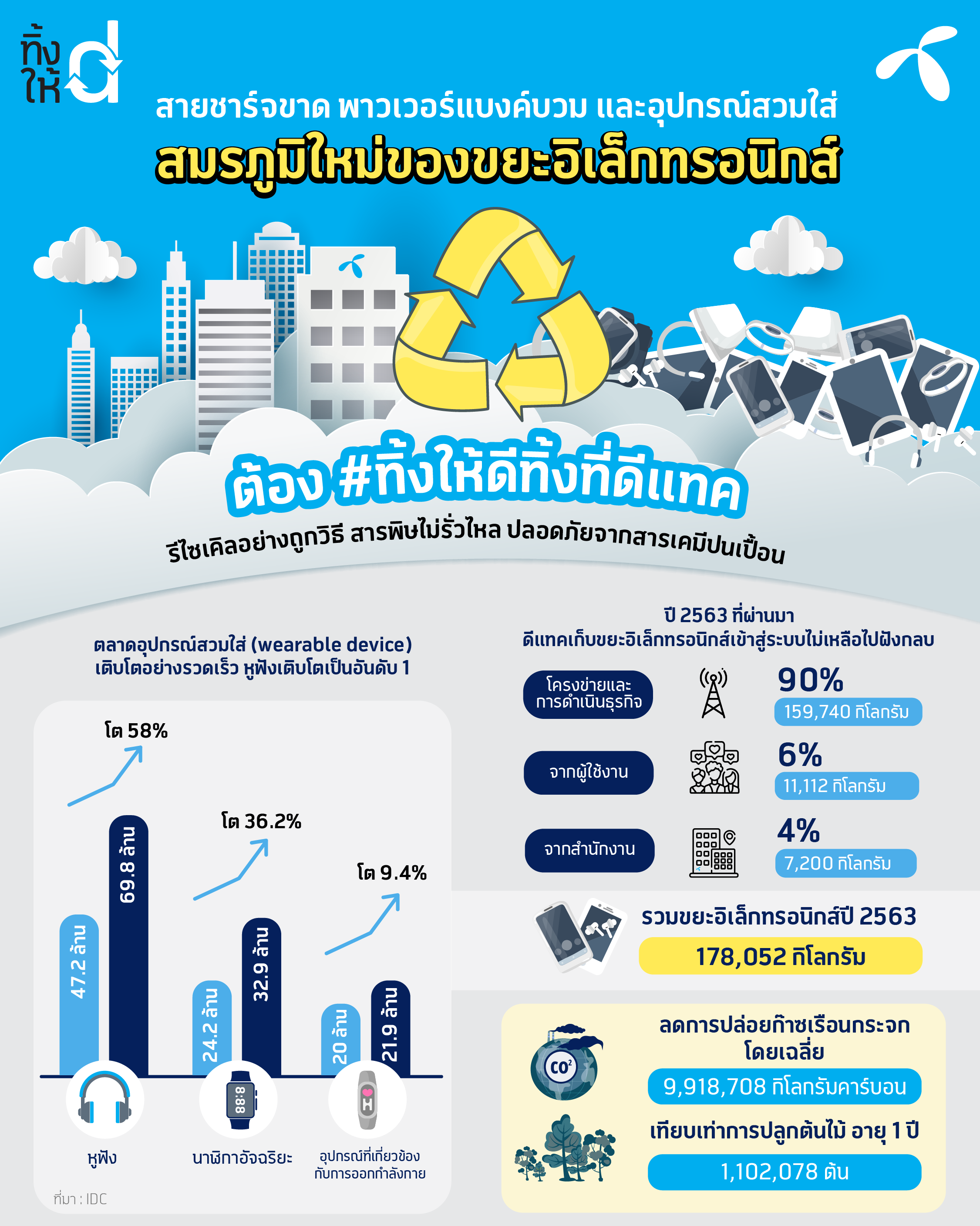 dtac ทิ้งให้ดี เริ่มจัดเก็บขยะอิเล็กทรอนิกส์ประเภทโทรศัพท์มือถือและอุปกรณ์สื่อสารอื่น ๆ มาตั้งแต่ปี พ.ศ.2555 สามารถจัดเก็บซากอุปกรณ์สื่อสารเพื่อนำกลับไปผ่านกระบวนการรีไซเคิลที่ถูกวิธีแล้วร่วม 1,810,330 ชิ้น คิดเป็นคาร์บอนที่ลดลงได้มากกว่า 32,248,751 กิโลคาร์บอน หรือเทียบเท่ากับการปลูกต้นไม้ให้โลกถึง 3,583,195 ต้น ที่สำคัญ ขยะอิเล็กทรอนิกส์ทุกชิ้นสามารถรีไซเคิลได้ร้อยละ 96-98 เปอร์เซ็นต์ ไม่เหลือเป็นเศษซากไปกำจัดแบบฝังกลบ