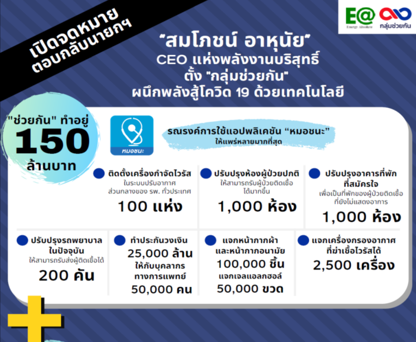 "สมโภชน์ อาหุนัย" ประธานเจ้าหน้าที่บริหาร EA ทำหนังสือตอบนายกฯ พร้อมร่วมมือระดับชาติฝ่าวิกฤติโควิด-19 ด้วยพลังสมองและเทคโนโลยี ดึงพันธมิตรตั้ง"กลุ่มช่วยกัน" ลุยติดตั้งอุปกรณ์เพิ่มศักยภาพในการปฏิบัติงานให้บุคลากรทางการแพทย์ทั่วประเทศ และ เพิ่มความปลอดภัยจากโรคให้กับประชาชนโดยใช้งบประมาณรวม 250 ล้านบาท พร้อมทั้งเสนอภาครัฐช่วยสนับสนุนให้ประชาชนดาวน์โหลดแอปพลิเคชัน “หมอชนะ” บนมือถือ เพื่อเป็นเครื่องมือชี้วัดความเสี่ยงและคัดกรองเพิ่มเติมโดยการแสดง QR Code ในโทรศัพท์มือถือที่ใช้พกพาประจำตัวเปรียบเสมือน eHealth Passport หรือ COVID VISA ใช้แสดงหรือตรวจสอบก่อนเข้าไปยังสถานที่ต่างๆ