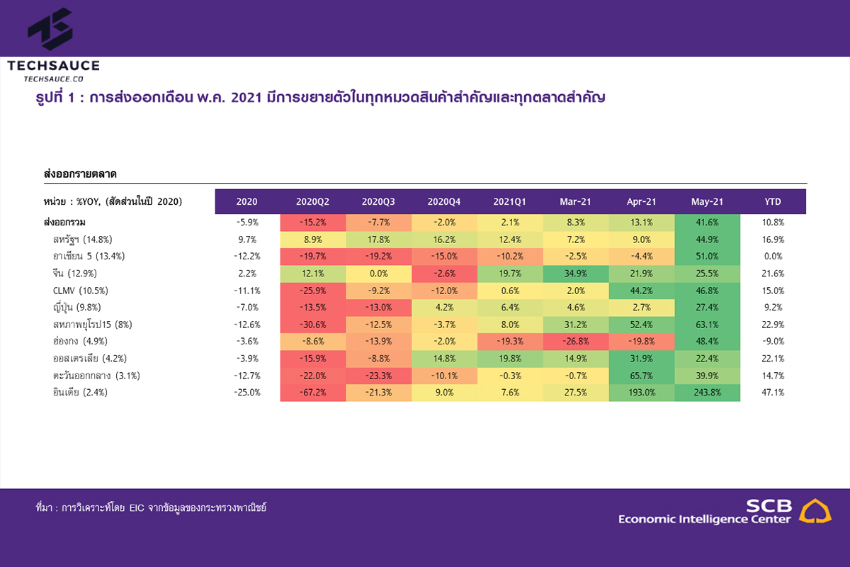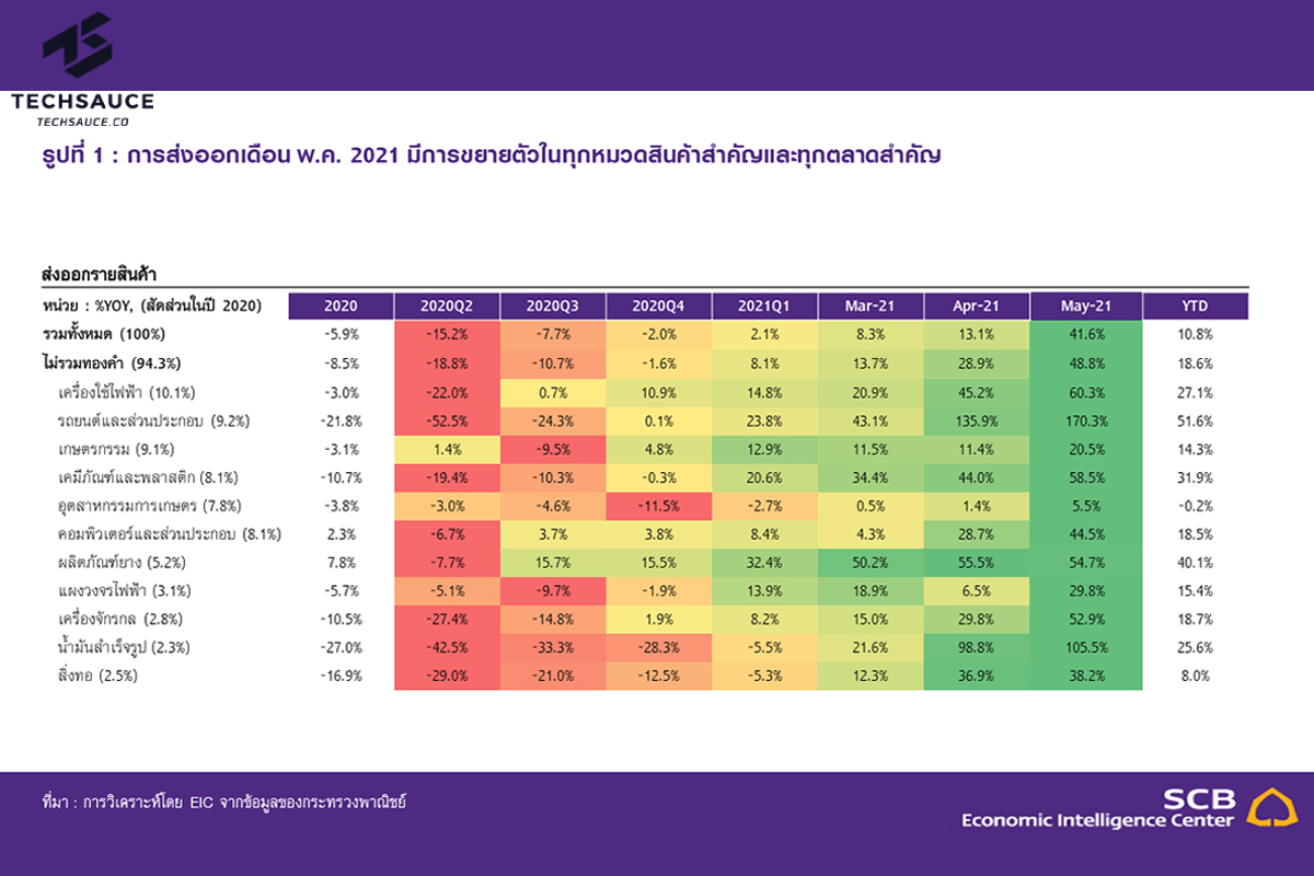 การส่งออกเดือน พ.ค. 2021 มีการขยายตัวในทุกหมวดสินค้าสำคัญและทุกตลาดสำคัญ