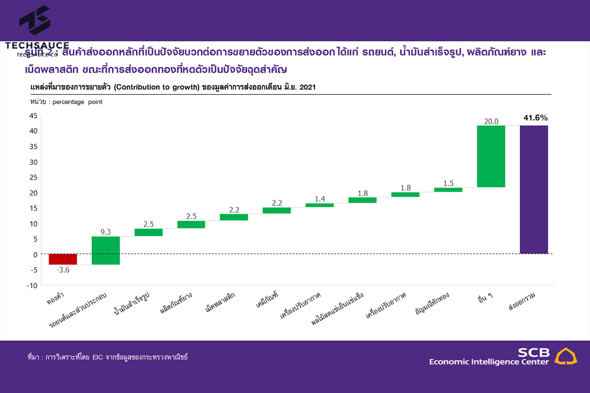 มูลค่าการส่งออกเดือนพฤษภาคม 2021 ขยายตัวถึง 41.6%YOY นับเป็นอัตราการขยายตัวที่สูงสุด ในรอบเกือบ 11 ปี และหากหักทองคำการส่งออกจะขยายตัวเพิ่มขึ้นเป็น 48.8%YOY ทำให้ในช่วง 5 เดือนแรกของปี 2021 มูลค่าการส่งออกขยายตัวที่ 10.8%YOY และหากไม่รวมทองคำ การส่งออกจะเติบโตถึง 18.6%YOY
