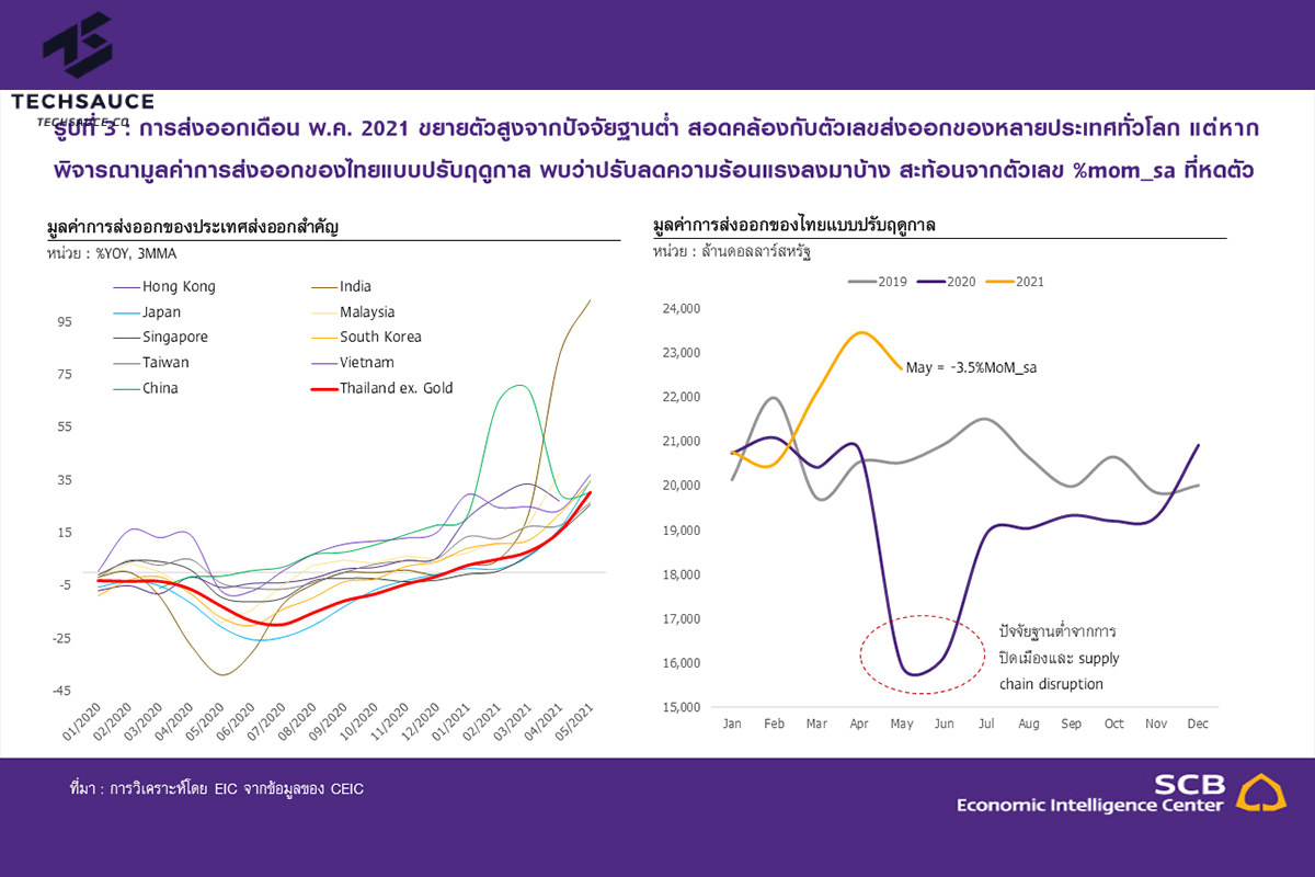 การส่งออกเดือน พ.ค. 2021 ขยายตัวสูงจากปัจจัยฐานต่ำ สอดคล้องกับตัวเลขส่งออกของหลายประเทศทั่วโลก แต่หากพิจารณามูลค่าการส่งออกของไทยแบบปรับฤดูกาล พบว่าปรับลดความร้อนแรงลงมาบ้าง สะท้อนจากตัวเลข %mom_sa ที่หดตัว