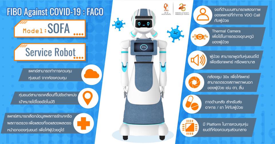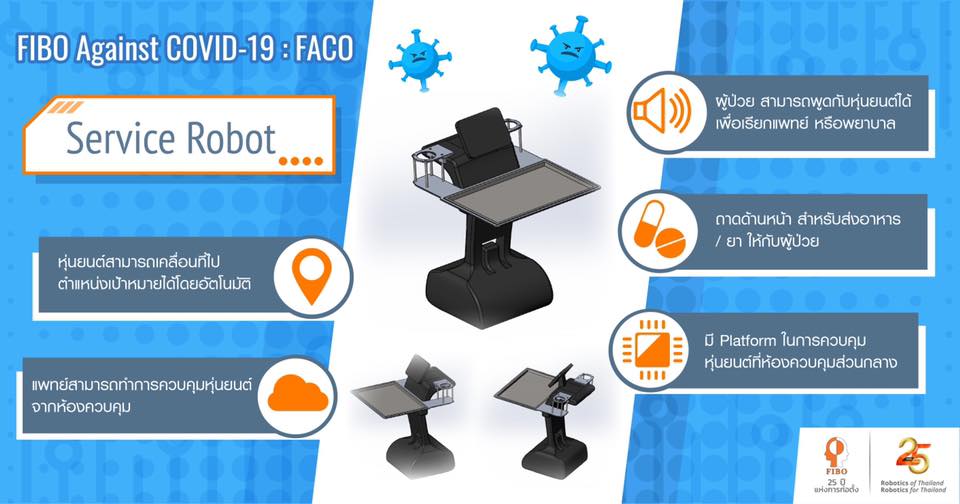 บริษัท ฟอร์มส์ ซินทรอน (ประเทศไทย) จำกัด บริษัท ซิสโก้ ซีสเต็มส์ (ประเทศไทย) จำกัด และบริษัท แอ็ดวานซ์อินฟอร์เมชั่นเทคโนโลยี จำกัด (มหาชน) ร่วมกับสถาบันวิทยาการหุ่นยนต์ภาคสนาม (FIBO) มหาวิทยาลัยเทคโนโลยีพระจอมเกล้าธนบุรี (มจธ.) พัฒนาระบบหุ่นยนต์ช่วยบุคลากรทางการแพทย์ ปฏิบัติงานในโรงพยาบาลช่วงสถานการณ์แพร่ระบาดของไวรัสโคโรนา “FIBO AGAINST COVID-19: FACO” โดยร่วมกันพัฒนาชุดระบบหุ่นยนต์บนแพลตฟอร์มการควบคุมเพื่อช่วยแพทย์ดูแลผู้ป่วยติดเชื้อ COVID-19 ในความร่วมมือ บริษัทได้ให้การสนับสนุนการพัฒนาชุดระบบหุ่นยนต์ฯ ประกอบด้วย