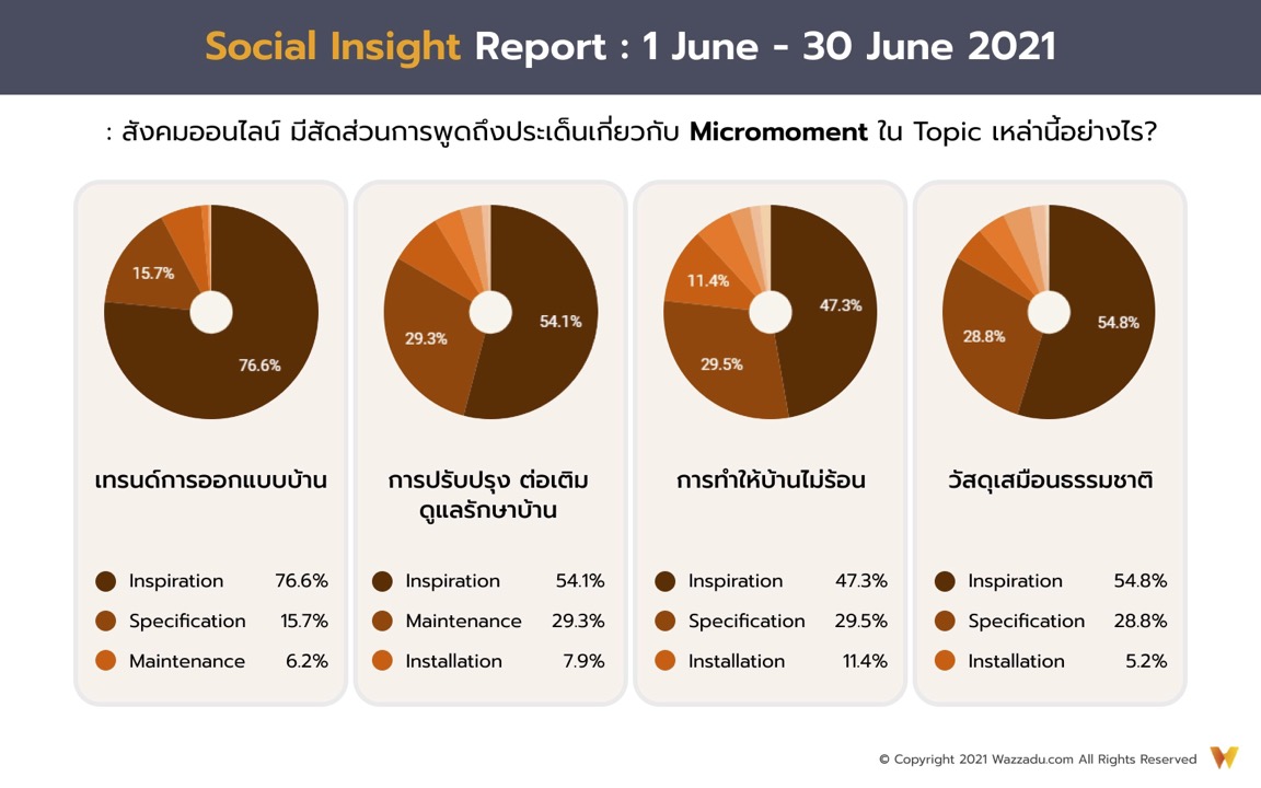 พูดถึงในขั้นตอนหา Inspiration สูงที่สุด 47.3% รองลงมา Specification 29.5 % และพูดถึงในขั้นตอน Installation 11.4% โดยมี Top 4 Keywords ที่พูดถึงการทำบ้านให้ไม่ร้อน และ Top 4 ที่เกี่ยวข้องกับพฤติกรรม (Micromoment) ซึ่งแบ่งคะแนนสูงสุด ให้เห็นเป็นสัดส่วนการพูดถึง (Mention) และค่าการมีปฏิสัมพันธ์ (EV)