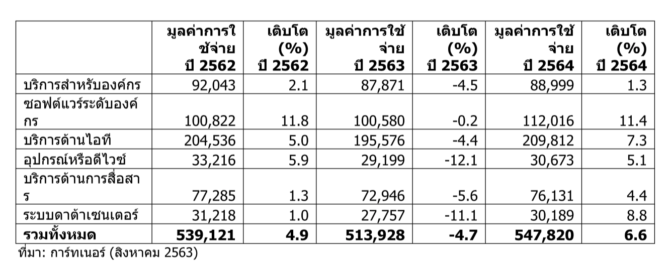 หลังการเติบโตอย่างแข็งแกร่งถึง 5% ในปี 2562 แต่ผลจาก COVID-19 ทำให้มูลค่าการใช้จ่ายด้านบริการไอทีลดลง ไม่ว่าจะเป็น ขนาด เงื่อนไข และประเภทของดีลในสัญญาทางการค้าล้วนได้รับผลกระทบ เนื่องจากโครงการขนาดใหญ่ ๆ ถูกตัดทอนหรือยกเลิกไป