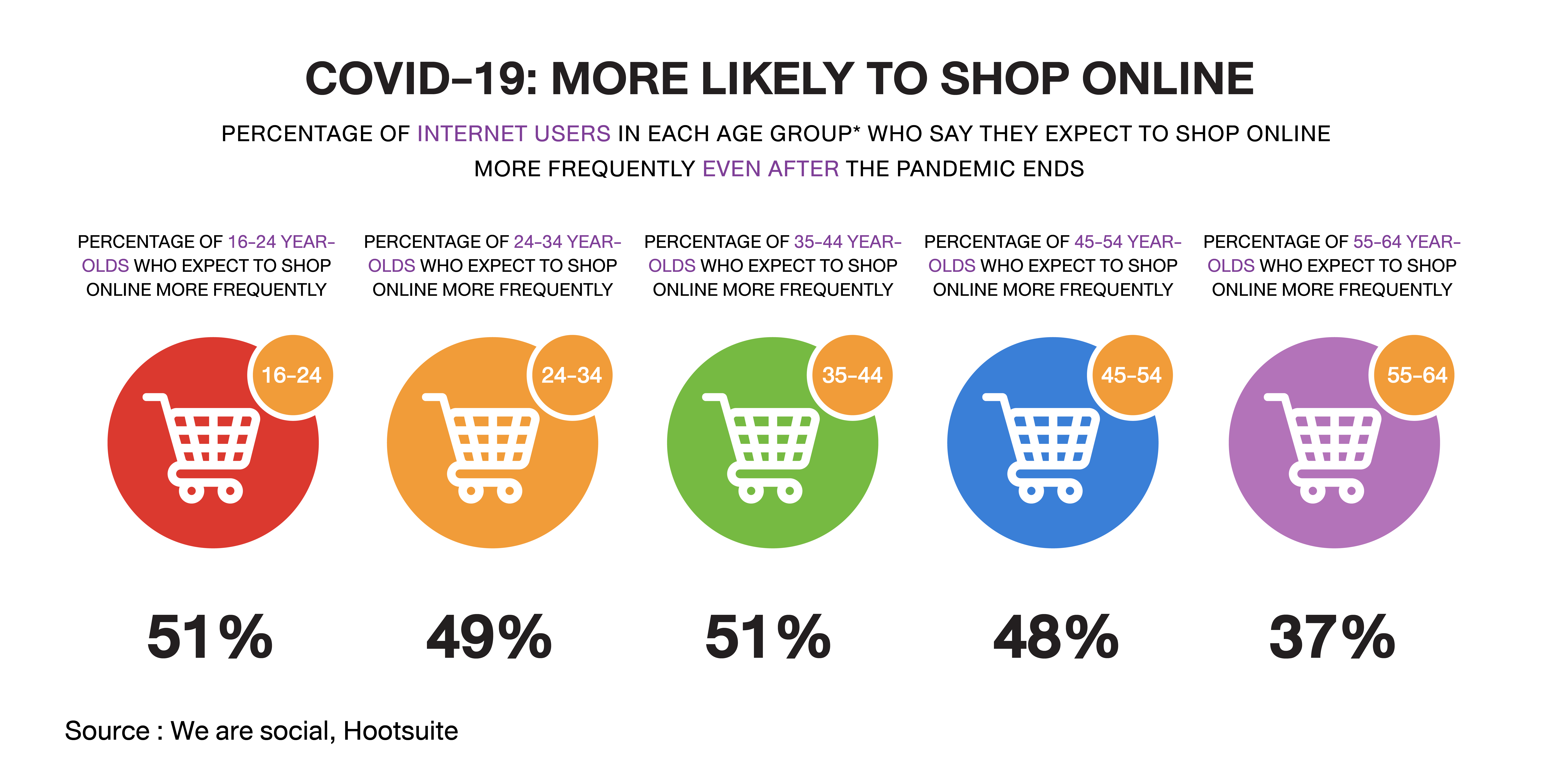 ระหว่างที่ธุรกิจร้านค้าและกิจกรรมทางเศรษฐกิจหยุดชะงักเพราะไวรัสโควิด-19 กลับเป็นการส่งเสริมให้ผู้คนรุ่นเก่า ที่ไม่เคยลองใช้เทคโนโลยีต้องหันมาเรียนรู้ ทั้งในการทำงานผ่านทางไกล หรือการซื้อของและสั่งอาหารออนไลน์ก็ตาม สิ่งที่สำคัญคือเมื่อมนุษย์เราได้ใช้เทคโนโลยีที่ทำให้เราสะดวกสบายมากขึ้น หรือตอบสนองความขี้เกียจเราแล้วนั้น ก็จะทำให้พฤติกรรมในการทำงานหรือใช้ชีวิตนั้นถูกเปลี่ยนไปโดยสิ้นเชิง โดยผลสำรวจผู้ที่อายุระหว่าง 16-54 ปี กว่าครึ่งนึงตอบว่ามีโอกาสที่จะซื้อของออนไลน์บ่อยขึ้น