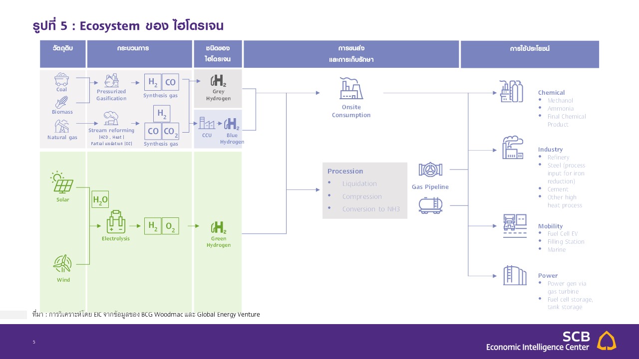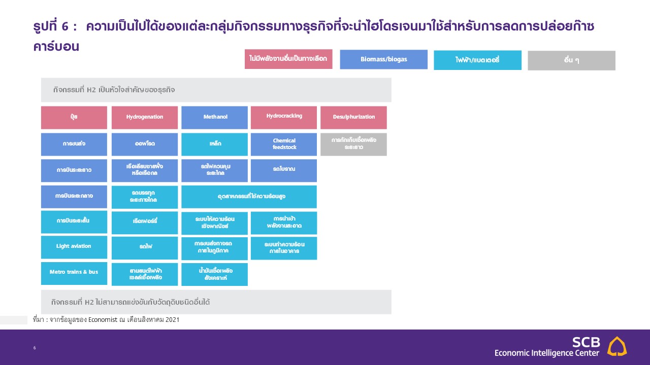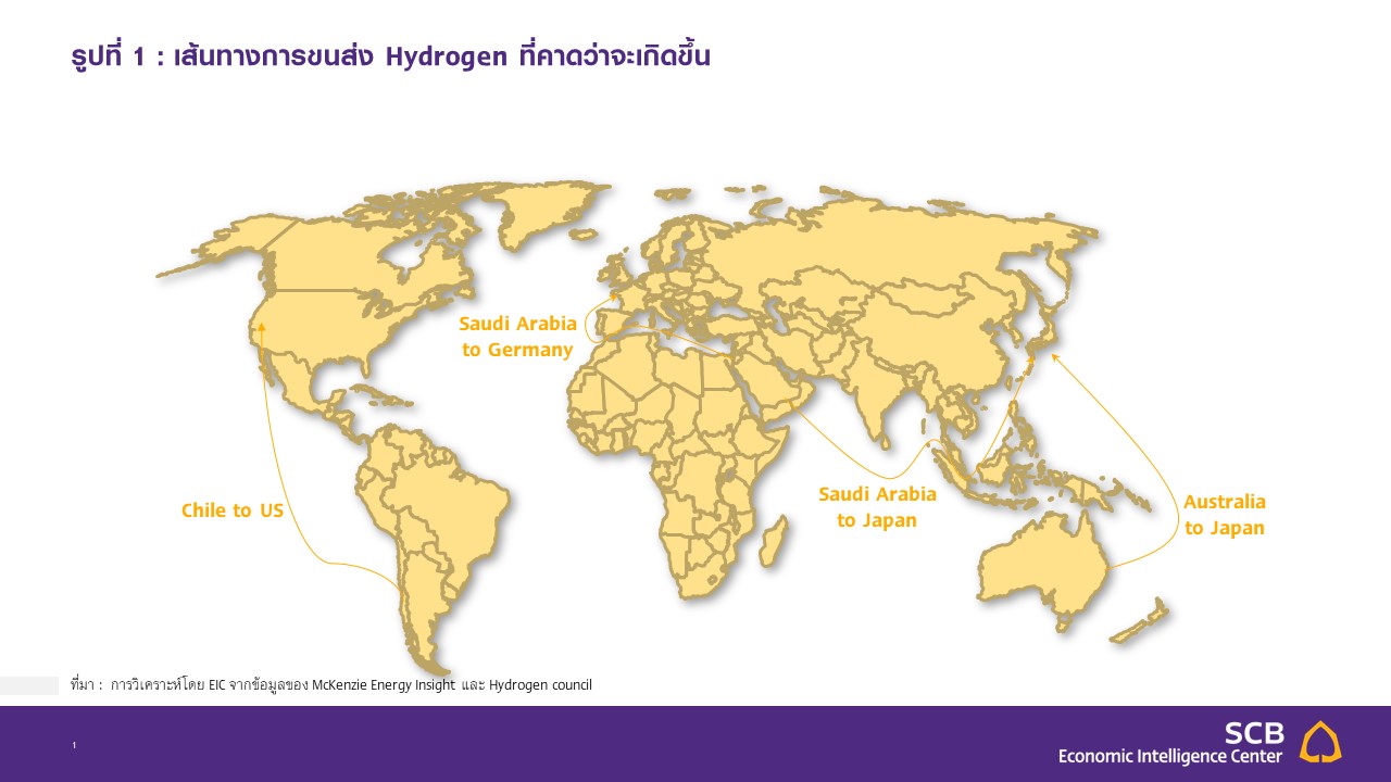 แผนไฮโดรเจนของแต่ละประเทศมีความแตกต่างกันตามบริบทของอุปสงค์ อุปทาน โครงสร้างพื้นฐานและความมั่นคงทางพลังงานปัจจุบัน ปัจจุบันมีโครงการที่เกี่ยวข้องกับการผลิตและใช้ไฮโดรเจนมากกว่า 200 โครงการที่ประกาศแล้วทั่วโลก โดยยุโรปเป็นผู้นำในด้านจำนวนโครงการไฮโดรเจนที่ประกาศเปิดตัวและครอบคลุมทั้งห่วงโซ่คุณค่าของไฮโดรเจนรวมทั้งกลางน้ำและปลายน้ำเพื่อที่จะสนับสนุนเศรษฐกิจไฮโดรเจนแบบบูรณาการโดยเน้นการใช้ในสหภาพยุโรปและประเทศใกล้เคียง ส่วนประเทศผู้ส่งออกน้ำมันหลักอย่างซาอุดีอาระเบีย ที่ตั้งเป้าหมายจะเป็นผู้ผลิตไฮโดรเจน เป็นอันดับ 1 ของโลก ซึ่งจะผลิตไฮโดรเจนให้ได้ 4 ล้านตันต่อปี ภายในปี 2030 ในขณะที่โครงการของญี่ปุ่นและเกาหลีเน้นด้านอุปสงค์และการใช้งานมากกว่าและจะพึ่งพาอุปทานของไฮโดรเจนจากตลาดโลก เนื่องจากทั้งสองประเทศไม่มีทรัพยากรเพียงพอที่จะสามารถผลิตไฮโดรเจนเพื่อสนองความต้องการใช้ในประเทศได้ โดยญี่ปุ่นมีแผนนำเข้าไฮโดรเจนจากออสเตรเลียที่ตั้งเป้าหมายว่าจะเป็นผู้ส่งออกไฮโดรเจนรายใหญ่ของโลกเช่นเดียวกับชิลี เนื่องจากสองประเทศนี้มีทรัพยากรทางธรรมชาติและโครงสร้างพื้นฐานที่เอื้อให้เป็นผู้นำด้านการส่งออกไฮโดรเจนได้ การพัฒนาทั้งในด้านเทคโนโลยีและในด้านตลาดซื้อขายนี้จะทำให้ไฮโดรเจนมีแนวโน้มที่จะเป็นสินค้าที่มีการซื้อขายทั่วโลกคล้ายกับเชื้อเพลิงฟอสซิลในปัจจุบันที่มา : การวิเคราะห์โดย EIC จากข้อมูลของ McKenzie Energy Insight และ Hydrogen council