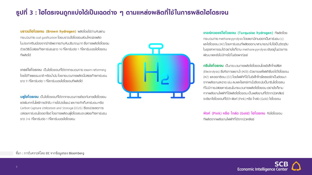 จะเห็นได้ว่า เมื่อพิจารณาจากกระบวนการผลิตแล้ว การกรีนไฮโดรเจน และบลูไฮโดรเจน จะเป็นวิธีที่มีการปล่อยก๊าซเรือนกระจกต่ำกว่าบราวน์และเกรย์ไฮโดรเจน แต่ในขณะเดียวกัน ทั้งกรีนและบลูไฮโดรเจนต้องมีต้นทุนที่เพิ่มขึ้นในกระบวนการผลิตและยังต้องมีการพัฒนาเทคโนโลยีเพื่อลดต้นทุนและขยายกำลังการผลิต