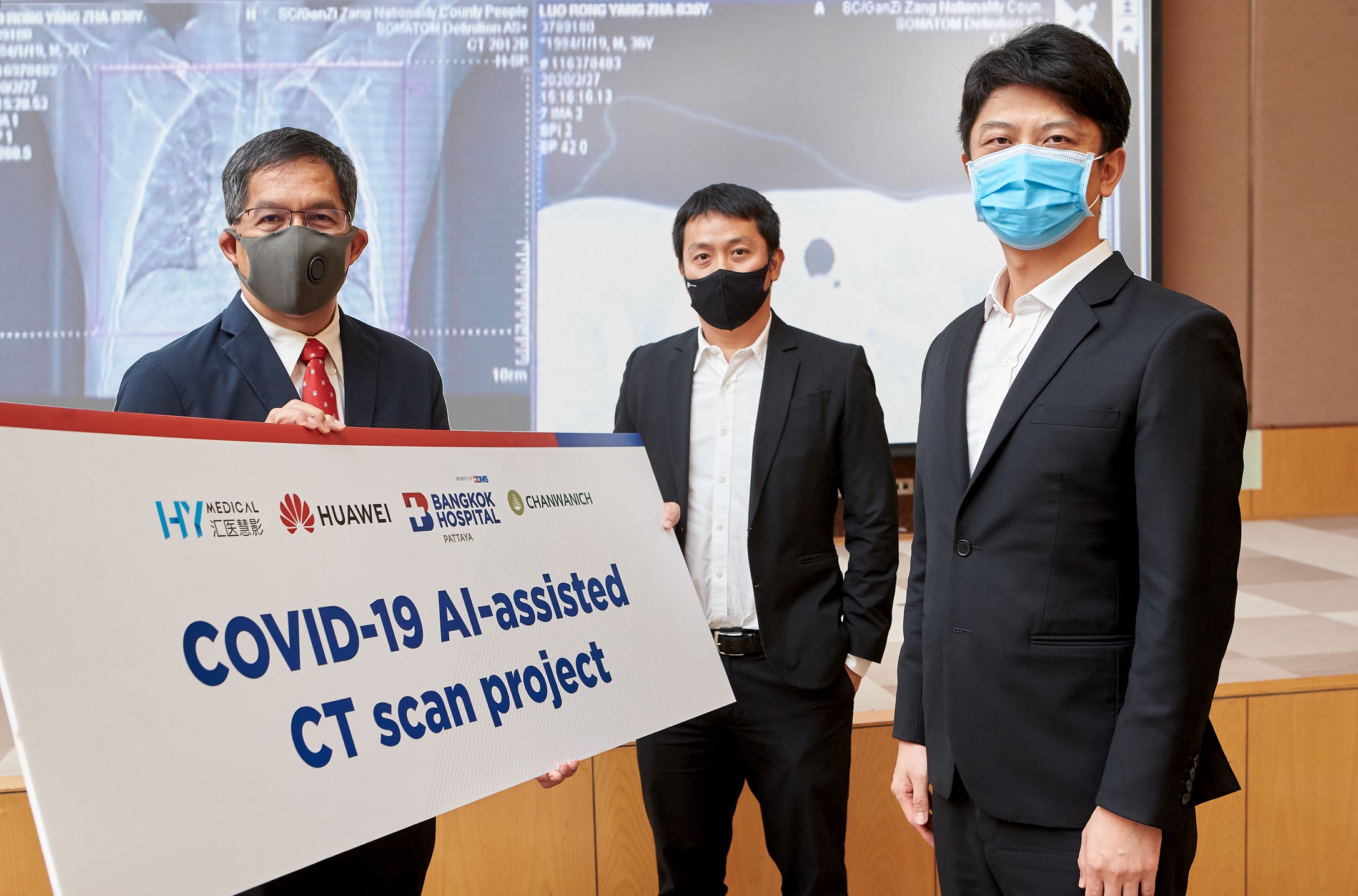 โซลูชัน AI บน HUAWEI CLOUD จากหัวเว่ยทำหน้าที่พิจารณาภาพ CT Scan เพื่อวิเคราะห์ว่าปอดนั้นได้รับเชื้อไวรัสโควิด-19 หรือยัง โดยยังสามารถบอกถึงระยะของการติดเชื้อว่าอยู่ในระยะเริ่มต้น ระยะลุกลาม หรือระยะรุนแรง ด้วยอัตราความแม่นยำของการวินิจฉัยภาพสูงถึง 96% และใช้เวลาในการอ่านเพียงไม่กี่วินาที จึงมีประสิทธิภาพอย่างยิ่ง ปัจจุบัน มีโรงพยาบาลในประเทศจีนกว่า 20 แห่ง นำโซลูชั่นนี้ไปปรับใช้เพื่อรับมือกับสถานการณ์โควิด-19 สำหรับในประเทศไทย ทางหัวเว่ยได้มอบโซลูชันดังกล่าวให้แก่โรงพยาบาลรามาธิบดีและโรงพยาบาลศิริราช เมื่อเร็วๆ นี้