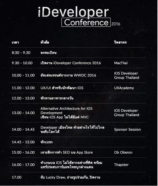 พบกับ iDeveloper Conference 2016 งานรวมกลุ่มนักพัฒนาในสาย iOS ครั้งใหญ่ในไทย เน้นเนื้อหาใหม่ล่าสุดจากงาน WWDC 2016 ที่ผู้เข้าร่วมงานจะได้รับฟังตั้งแต่การเริ่มต้นจะมีแอพสักตัว ไปจนถึงการออกแบบและการโปรโมทแอพของคุณ โดยกูรู, เจ้าของแอพชื่อดัง และผู้เชี่ยวชาญที่เป็นที่รู้จักในวงการ
