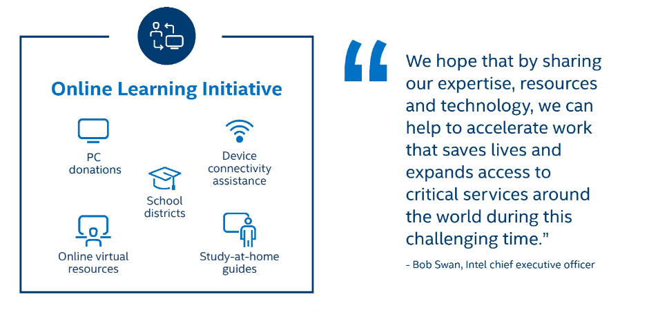 โครงการ Intel Online Learning Initiative จะให้การสนับสนุนองค์กรที่ไม่แสวงหาผลกำไรและพันธมิตรทางธุรกิจด้านการศึกษา เพื่อช่วยนักเรียนและนักศึกษาที่ขาดแคลนเทคโนโลยีให้มีอุปกรณ์และสามารถเข้าถึงแหล่งการเรียนรู้ออนไลน์ได้ และด้วยการร่วมมืออย่างใกล้ชิดกับโรงเรียนรัฐบาลในระดับชุมชนเพื่อบริจาคเครื่องคอมพิวเตอร์ (PCs) สนับสนุนการเข้าถึงแหล่งการเรียนรู้ออนไลน์ คู่มือสำหรับระบบการเรียนการสอนจากที่บ้านพร้อมความช่วยเหลือด้านอุปกรณ์เชื่อมต่อ ทั้งนี้ โครงการสนับสนุนการศึกษาออนไลน์ของ INTEL เกิดจากคำมั่นสัญญาที่ INTEL มีเสมอมาด้านการยกระดับการเรียนรู้ด้วยเทคโนโลยี โดยโครงการนี้จะเริ่มต้นทันทีในภูมิภาคที่มีความต้องการมากที่สุดในประเทศสหรัฐอเมริกาและขยายไปทั่วโลก
