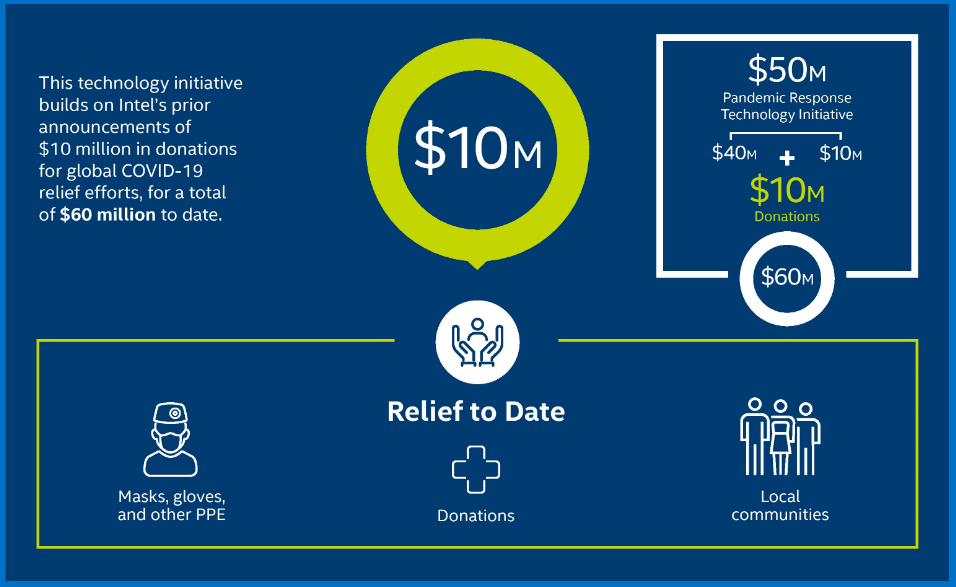 วันนี้ INTEL ให้คำมั่นสัญญาเพิ่มทุนจำนวน 50 ล้านดอลลาร์สหรัฐฯ ในโครงการริเริ่มด้านเทคโนโลยีเพื่อรับมือโรคระบาดและต่อสู้กับไวรัสโคโรนา ผ่านการเร่งสร้างการเข้าถึงเทคโนโลยี ณ จุดดูแลผู้ป่วย เร่งวิจัยทางวิทยาศาสตร์ และสร้างความเชื่อมั่นว่านักเรียนนักศึกษาจะสามารถเข้าถึงการเรียนการสอนออนไลน์ได้ โดยเงินจำนวนนี้ครอบคลุมสำหรับส่วนของกองทุนนวัตกรรมที่เปิดรับคำขอสนับสนุนเม็ดเงิน เพื่อให้นำเอาความเชี่ยวชาญและทรัพยากรของ INTEL ไปใช้ในการสร้างความเปลี่ยนแปลงได้ในทันที ก่อนหน้านี้ INTEL ยังได้บริจาคเงินจำนวน 10 ล้านดอลลาร์สหรัฐฯเพื่อสนับสนุนชุมชนท้องถิ่นต่างๆ ในช่วงเวลาที่ยากลำบากนี้อีกด้วย
