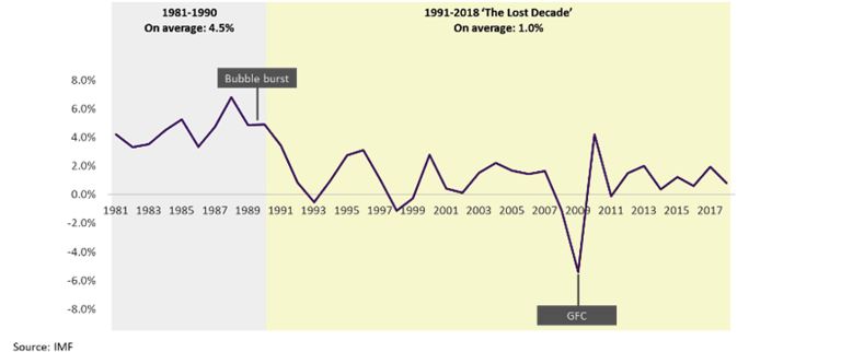 เติบโตโดยเฉลี่ยเพียงปีละ 1% เทียบกับอัตราการเติบโตโดยเฉลี่ยในช่วง 1981-1990 ที่อยู่ราว 4.5% ต่อปี โดยในช่วงระยะเวลาดังกล่าว รัฐบาลญี่ปุ่นพยายามทุกวิถีทางเพื่อที่จะพยุงให้เศรษฐกิจของประเทศสามารถเติบโตต่อไปได้ โดยเฉพาะการลดดอกเบี้ยนโยบายเพื่อกระตุ้นเศรษฐกิจ ทั้งนี้นับตั้งแต่การขึ้นดอกเบี้ยเพื่อหยุดความร้อนแรงของตลาดอสังหาริมทรัพย์และตลาดหุ้นในปี 1989 ที่เป็นช่วงก่อนฟองสบู่แตก อัตราดอกเบี้ยนโยบายของญี่ปุ่นก็อยู่ในทิศทางขาลงโดยตลอดและอยู่ในระดับที่ติดลบในปัจจุบัน
