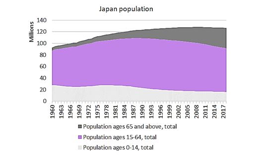 นอกจากนี้ สิ่งที่คอยซ้ำเติมปัญหาเศรษฐกิจของญี่ปุ่นคือ โครงสร้างประชากรของประเทศที่ก้าวเข้าสู่สังคมผู้สูงอายุ โดยในปี 2018 ญี่ปุ่นมีสัดส่วนประชากรที่มีอายุ 65 ปีขึ้นไปสูงถึง 27.6% ของประชากรทั้งประเทศ ซึ่งส่งผลกระทบในทางลบต่อการเติบโตของเศรษฐกิจ เนื่องจากผู้สูงอายุมีแนวโน้มการบริโภคและการจับจ่ายใช้สอยที่มีข้อจำกัดมากขึ้น และยิ่งไปกว่านั้น สัดส่วนประชากรสูงอายุที่เพิ่มมากขึ้น ยังส่งผลให้เกิดปัญหาใหญ่อีกประการคือ รายจ่ายด้านสวัสดิการสังคมที่สูงขึ้นตามไปด้วย โดยในปี 2000 ค่าใช้จ่ายสวัสดิการสังคมในญี่ปุ่นคิดเป็น 17.6% ของงบประมาณรายจ่าย และสัดส่วนดังกล่าวได้เพิ่มขึ้นอย่างรวดเร็วจนถึง 33% ในปี 2018
