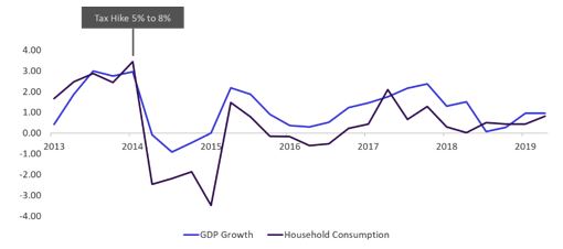จากเรื่องราวข้างต้น ทำให้เราพอเห็นภาพว่าการขึ้นนโยบายภาษีการบริโภคน่าจะเป็นเครื่องมือท้ายๆ ที่รัฐบาลญี่ปุ่นเหลืออยู่และจำเป็นต้องหยิบมาใช้เพื่อหารายได้มาสนับสนุนรายจ่ายด้านสวัสดิการสังคมที่ยังคงมีแนวโน้มเพิ่มสูงขึ้นอย่างต่อเนื่อง รวมถึงเพื่อรักษาเสถียรภาพการเงินของประเทศให้แข็งแรงยิ่งขึ้น ซึ่งการปรับขึ้นภาษีในครั้งนี้ยังคงสร้างความกังวลว่าอาจฉุดให้เศรษฐกิจญี่ปุ่นในช่วงไตรมาสสุดท้ายของปีกลับมาหดตัวอีกครั้ง เนื่องจากการปรับขึ้นภาษีรอบก่อนจาก 5% เป็น 8% ในเดือนเมษายน ปี 2014 ส่งผลกระทบต่อเศรษฐกิจญี่ปุ่นและการบริโภคในประเทศอย่างรุนแรง อย่างไรก็ดี รัฐบาลญี่ปุ่นคาดหวังว่ามาตรการช่วยเหลือระยะสั้น และมาตรการพิเศษจะช่วยให้ผลกระทบที่เกิดขึ้นไม่รุนแรงอย่างคราวก่อน เช่น การเครดิตภาษีคืน 2-5% ผ่านระบบสะสมคะแนนหากผู้บริโภคซื้อสินค้าจากร้านสะดวกซื้อ หรือร้านค้าขนาดเล็กและขนาดกลางโดยผ่านช่องทางการชำระเงินอิเล็กทรอนิกส์ เป็นระยะเวลา 9 เดือน รวมถึงนโยบายการช่วยเหลือผู้มีรายได้น้อย เป็นต้น