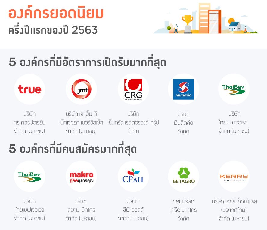 5 องค์กรที่มีคนสมัครมากที่สุด อันดับหนึ่ง บริษัท ไทยเบฟเวอเรจ จำกัด (มหาชน) อันดับสอง บริษัท สยามแม็คโคร จำกัด (มหาชน) อันดับสาม บริษัท ซีพี ออลล์ จำกัด (มหาชน) อันดับสี่ กลุ่มบริษัทเครือเบทาโกร จำกัด อันดับห้า บริษัท เคอรี่ เอ็กซ์เพรส (ประเทศไทย) จำกัด (มหาชน)