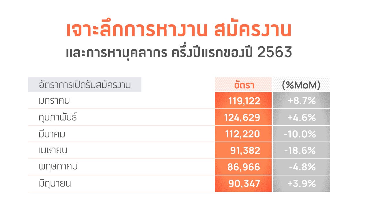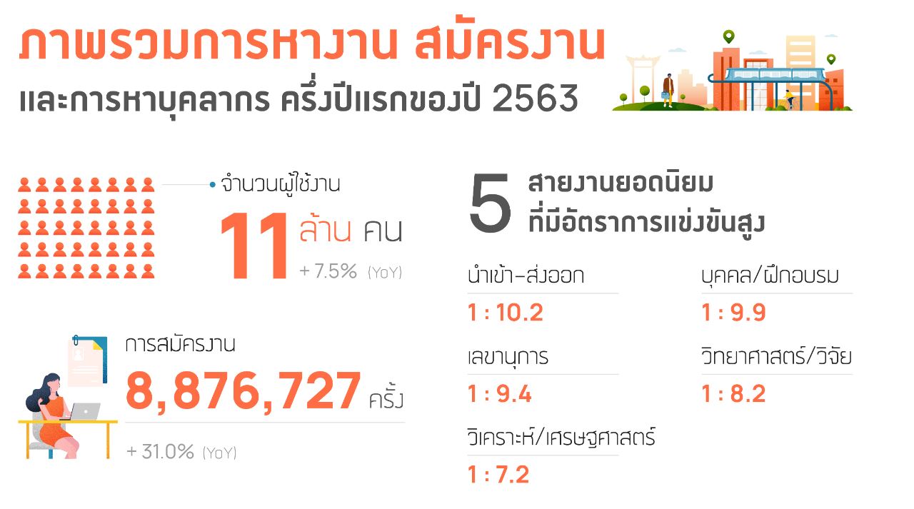 ซึ่งมีการเปิดรับสูงสุดในเดือนกุมภาพันธ์อยู่ที่ 124,629 อัตรา แต่ในช่วงเดือนมีนาคม – เมษายนการจ้างงานลดลง 16.5% เทียบกับเดือนมกราคม - กุมภาพันธ์ ซึ่งเป็นช่วงเวลาที่การระบาดของไวรัสโควิด-19 เริ่มมีตัวเลขผู้ติดเชื้อสูงขึ้นและกระจายวงกว้างมากขึ้น ทำให้ธุรกิจต่าง ๆ ได้รับผลกระทบอย่างหลีกเลี่ยงไม่ได้ ส่วนด้านผู้ใช้งาน หางาน สมัครงาน มีการใช้งานมากกว่า 11 ล้านคน เติบโตขึ้น 7.5% ซึ่งมีการสมัครงาน 8,876,727 ครั้ง เติบโตขึ้น 31.0% เมื่อเปรียบเทียบกับช่วงเดียวกันของปีก่อน