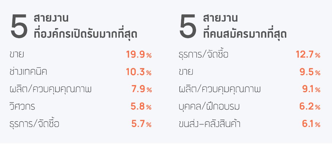 5 สายงานที่องค์กรเปิดรับมากที่สุด อันดับหนึ่ง ขาย คิดเป็น 19.9% อันดับสอง ช่างเทคนิค คิดเป็น 10.3% อันดับสาม ผลิต/ควบคุมคุณภาพ คิดเป็น 7.9% อันดับสี่ วิศวกร คิดเป็น 5.8% อันดับห้า ธุรการ/จัดซื้อ คิดเป็น 5.7%