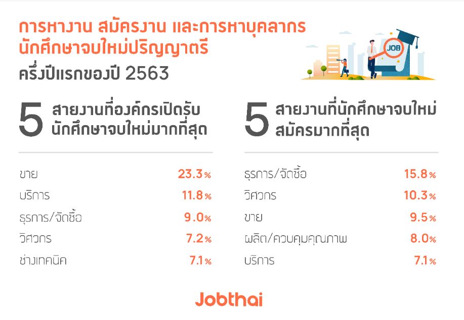 5 สายงานที่องค์กรเปิดรับนักศึกษาจบใหม่ปริญญาตรีมากที่สุด อันดับหนึ่ง ขาย คิดเป็น 23.3% อันดับสอง บริการ คิดเป็น 11.8% อันดับสาม ธุรการ/จัดซื้อ คิดเป็น 9.0% อันดับสี่ วิศวกร คิดเป็น 7.2% อันดับห้า ช่างเทคนิค คิดเป็น 7.1%