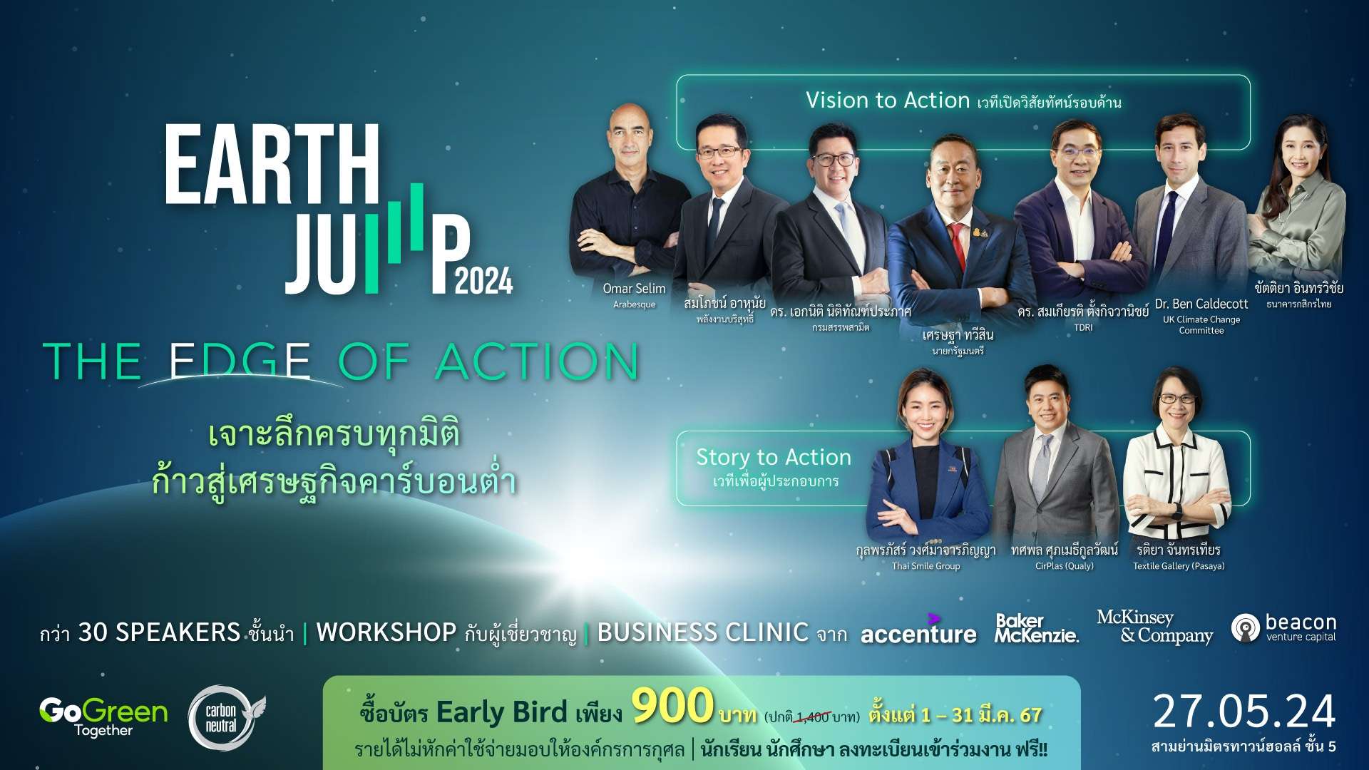 นอกจากนี้ ยังมีฟอรั่มแห่งปีที่ธนาคารกสิกรไทยจะพานักธุรกิจและผู้ประกอบการก้าวสู่เศรษฐกิจคาร์บอนต่ำ ‘EARTH JUMP 2024 : The Edge of Action’ เรียนรู้แนวคิดและเทรนด์ธุรกิจจากผู้บริหารองค์กรชั้นนำและเจ้าของธุรกิจกว่า 30 ราย เปิดโอกาสการรับคำปรึกษาเชิงลึกแบบตัวต่อตัวจาก 10 บริษัททั้งในไทยและระดับโลก พร้อมกิจกรรมเวิร์กชอป จะจัดในวันที่ 27 พฤษภาคม 2567 ณ สามย่านมิตรทาวน์