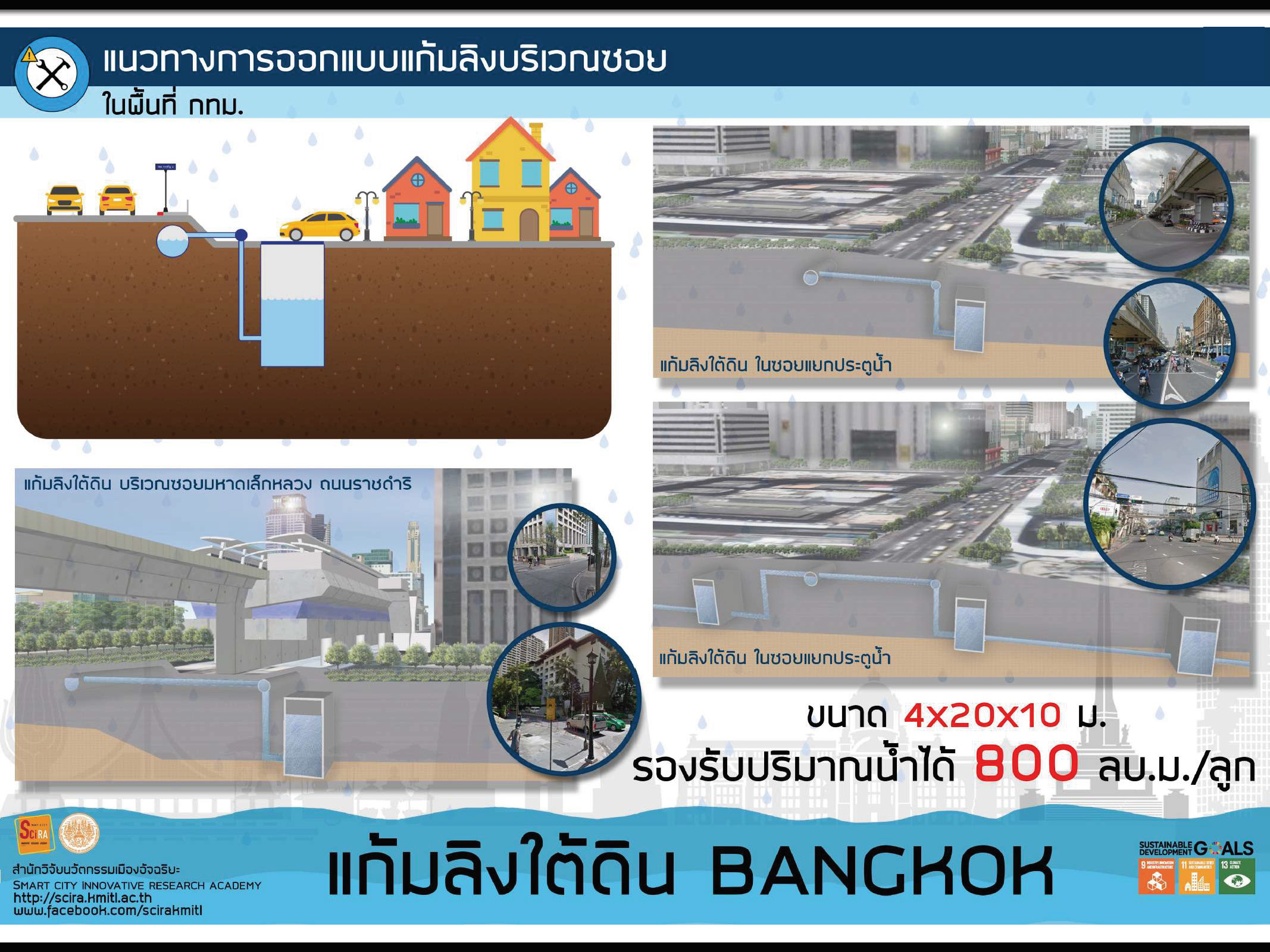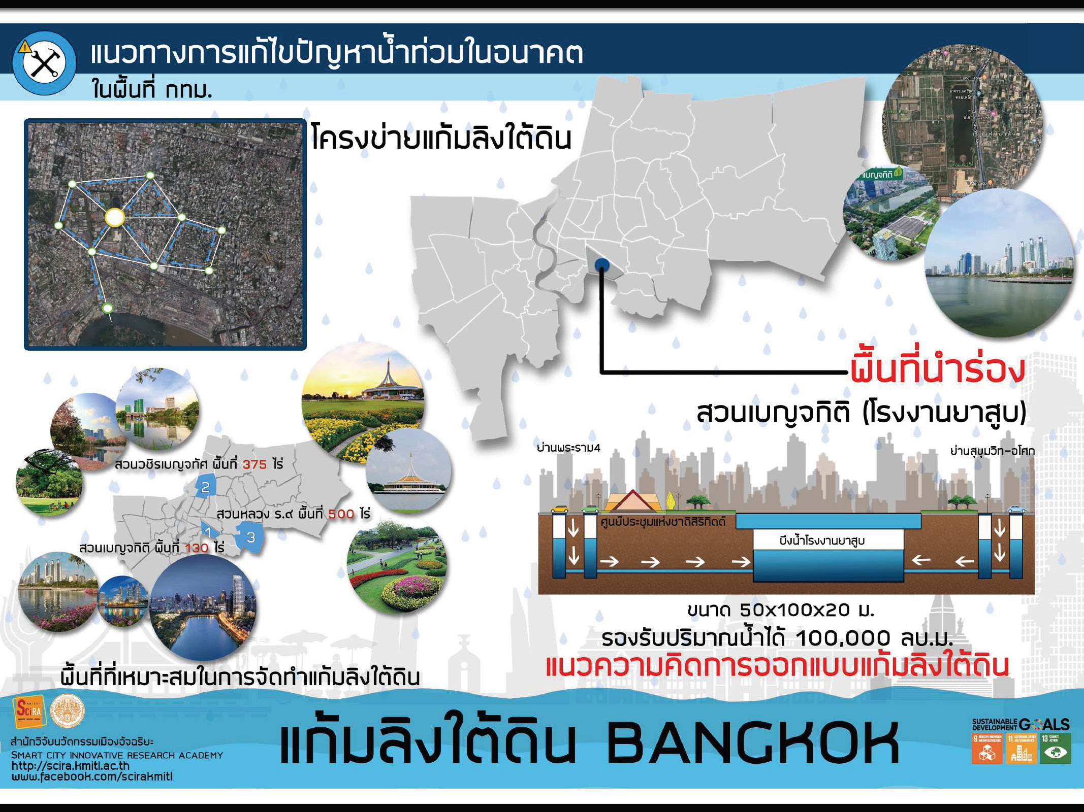 การทำแก้มลิงใช้วิธีเปิดหน้าดินเป็นแท็งก์เก็บกักน้ำ โดยใช้เครื่องมือเจาะคว้านดินด้านในสร้างเป็นอ่างเก็บน้ำขนาดใหญ่ใต้ดิน และไม่กระทบการใช้ประโยชน์จากผิวหน้าดิน เพื่อลำเลียงน้ำฝนบนพื้นถนนไปกักเก็บไว้ใต้ดิน รอระบายไปยังแหล่งน้ำได้อย่างมีประสิทธิภาพภายใน 15 นาที โดยมีแนวคิดการพัฒนานำร่องในพื้นที่สวนเบญจกิติ ที่จะช่วยลำเลียงน้ำรอการระบายลงสู่ใต้ดินได้ 1 แสนลูกบาศก์เมตร ครอบคลุมพื้นที่ 9 แสนตารางเมตร ใน 4 เขต คือ คลองเตย วัฒนา สาธร ยานาวา และต่อยอดการใช้นวัตกรรมสู่ถนนเส้นอื่น ๆ เพิ่มเติม รวมถึงตรอกซอกซอยในชุมชนเพื่อการจัดการน้ำรอระบายครบวงจร