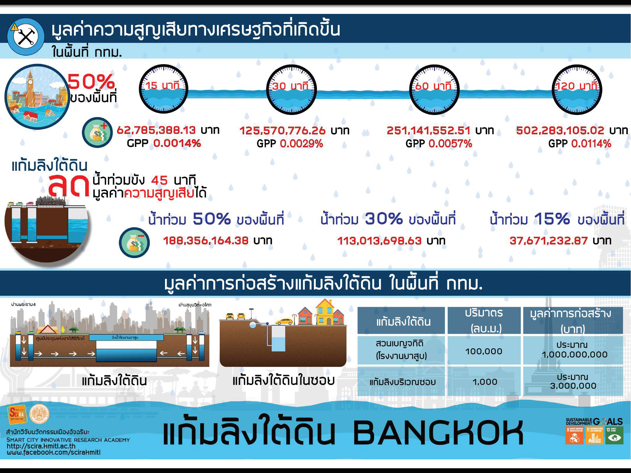ส่วนต้นทุนการก่อสร้างอยู่ที่ 1 พันล้านบาท แต่สามารถลดมูลค่าความสูญเสียด้านเวลาและเศรษฐกิจกว่า 500 ล้านบาท ต่อน้ำท่วมขัง 1 ครั้งในระยะเวลา 2 ชั่วโมง นับว่าโครงการแก้มลิงใต้ดินเป็นโครงการที่ใช้งบลงทุนต่ำ แต่สามารถช่วยจัดการปัญหาได้อย่างมีประสิทธิภาพและคุ้มค่า