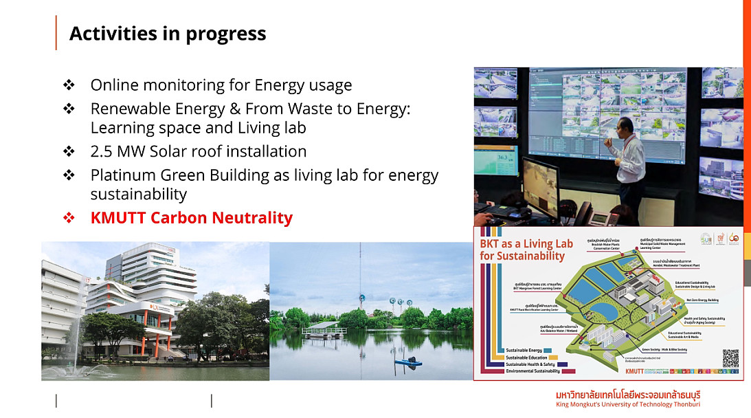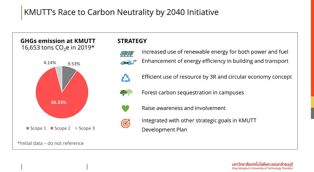 “สาเหตุที่อุณหภูมิของโลกร้อนขึ้นเกิดจากการปลดปล่อยคาร์บอนไดออกไซด์ (CO2) จากกิจกรรมต่างๆของมนุษย์ออกสู่ชั้นบรรยากาศ เมื่อสถานการณ์ใกล้ถึงจุดอันตราย อุณหภูมิจะสูงขึ้นอีกและจะกลับคืนมาไม่ได้ ทำให้แต่ละประเทศ รวมทั้งองค์กรและบริษัทขนาดใหญ่ เริ่มออกมาประกาศเจตนารมณ์ Carbon Neutralityภายในปี ค.ศ. 2050 มจธ. ในฐานะมหาวิทยาลัยที่มีการศึกษาวิจัยเกี่ยวกับการเปลี่ยนแปลงของสภาพภูมิอากาศมายาวนานกว่า 20 ปี จึงมีความพร้อมทั้งในเรื่องขององค์ความรู้ ผู้เชี่ยวชาญ บุคลากร และเทคโนโลยี นอกจากนี้มหาวิทยาลัยยังมีเป้าหมายเชิงยุทธศาสตร์ด้านการพัฒนาเพื่อความยั่งยืนที่ชัดเจน อีกทั้งยังเป็นมหาวิทยาลัยที่ได้รับการจัดอันดับในระดับแนวหน้าเรื่องการอนุรักษ์พลังงานทั้งในประเทศและต่างประเทศ ซึ่งเป็นสิ่งที่สะท้อนถึงการทำงานที่ผ่านมาของมหาวิทยาลัยที่มีความเข้าใจและมีความรู้เกี่ยวกับเรื่องดังกล่าว
