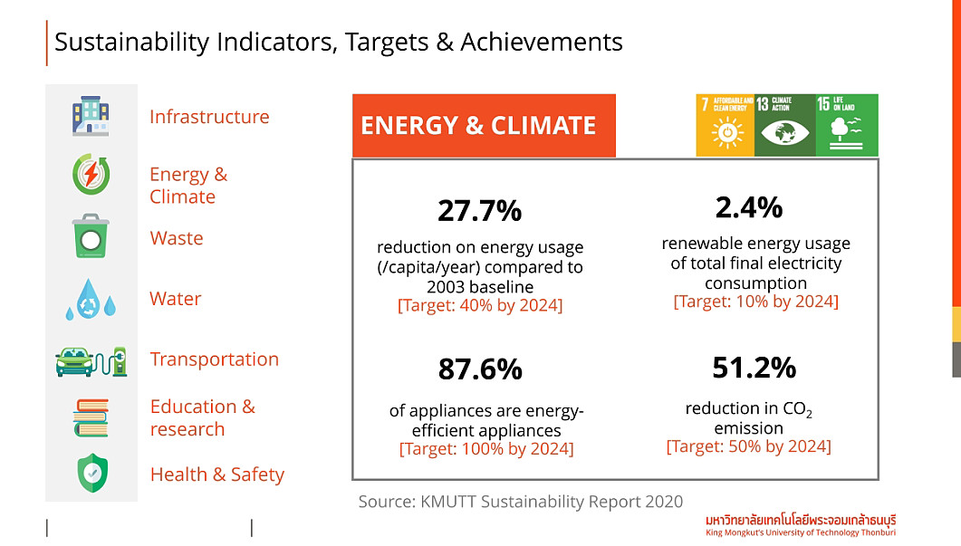 ทั้งนี้ KMUTT Carbon Neutrality 2040 ถูกกำหนดเป็นเป้าหมายเชิงยุทธศาสตร์ใหม่ด้านการพัฒนาเพื่อความยั่งยืนของ มจธ. ซึ่งจะบูรณาการกับเป้าหมายเชิงกลยุทธ์อีก 5 ด้าน (KMUTT Sustainable University for Sustainable Development Goals) ได้แก่ 1. การสร้างการมีส่วนร่วมของนักศึกษา (Increasing the Student Engagement) 2. การสร้างผลกระทบเชิงบวกจากผลงานวิจัยและนวัตกรรม (Demonstrating the Impact of Research and Innovation) 3. การสร้างการมีส่วนร่วมกับชุมชน (Encouraging the Community Engagement) 4. การสร้างโครงสร้างพื้นฐานและสภาพแวดล้อมที่เป็นมิตรกับสิ่งแวดล้อม (Building Green Infrastructure & Environment) และ 5. การสร้างสรรค์ระบบการบริหารที่ยั่งยืน (Creating a Sustainable Management System)