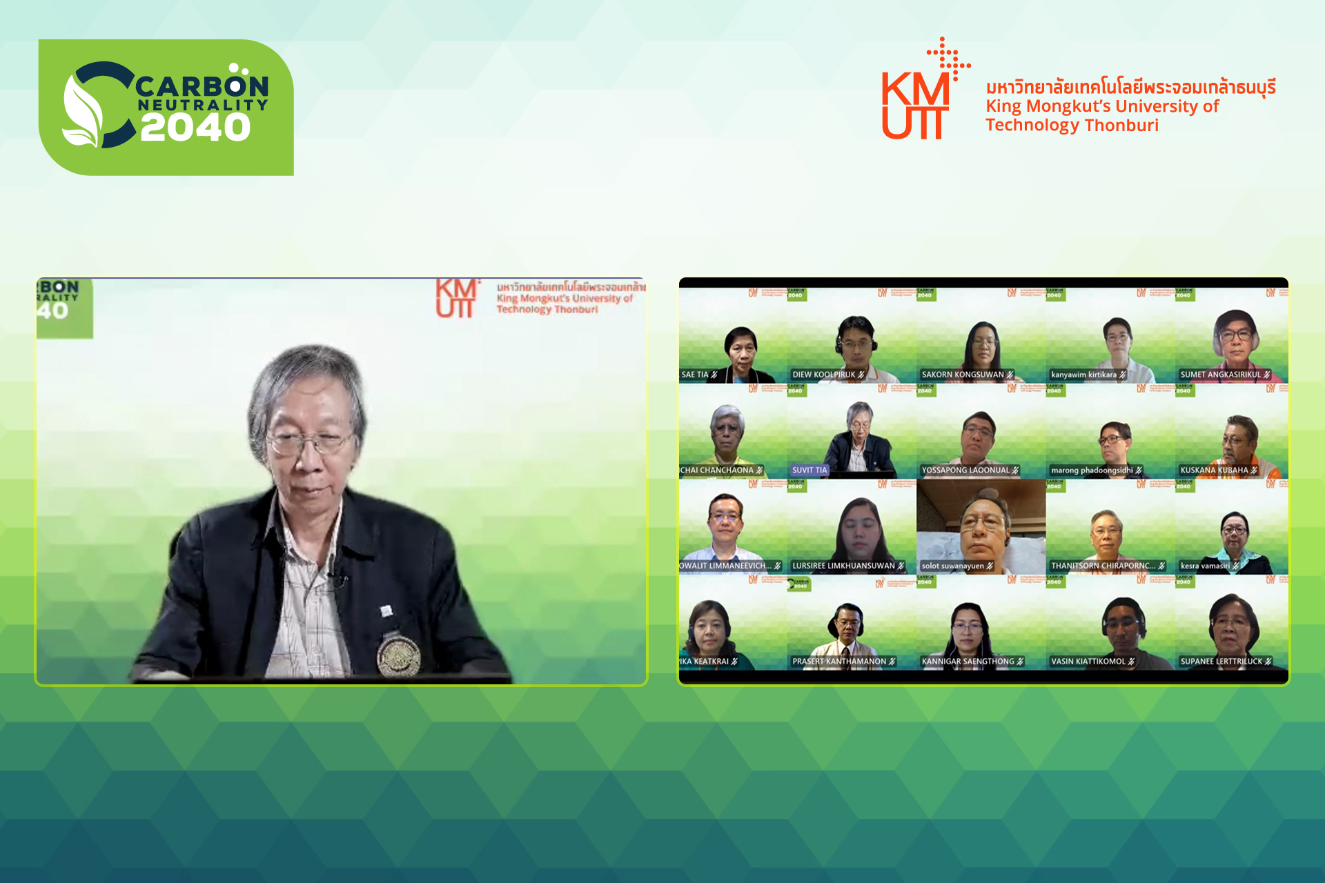 มหาวิทยาลัยจึงตัดสินใจประกาศเจตนารมณ์ ในการลดการปลดปล่อยคาร์บอนสุทธิเป็นศูนย์ภายในปี ค.ศ.2040 (KMUTT Carbon Neutrality 2040) โดยการเพิ่มการใช้พลังงานหมุนเวียน การเพิ่มประสิทธิภาพพลังงานในอาคารและการเดินทาง การใช้ทรัพยการอย่างคุ้มค่า และการปลูกต้นไม้เพื่อดูดซับคาร์บอนฯ เพื่อช่วยลดผลกระทบของสถานการณ์การเปลี่ยนแปลงของสภาพภูมิอากาศ (Climate Change) ให้เป็นแบบอย่างและสาเหตุที่ มจธ. ดำเนินการให้เร็วกว่าที่รัฐบาลประกาศไว้ เพื่อแสดงให้เห็นว่าทุกภาคส่วนของประเทศไม่ได้นิ่งเฉย เมื่อมีความพร้อมก็สามารถเริ่มดำเนินการได้ก่อน และเชื่อว่าหลังจากนี้จะมีสถาบันการศึกษาอื่นๆ มีนโยบายที่สอดรับกับนโยบายของประเทศในข้างต้นออกมาด้วยเช่นกัน ซึ่งจะเป็นผลดีต่อภาพรวมของประเทศและโลก”