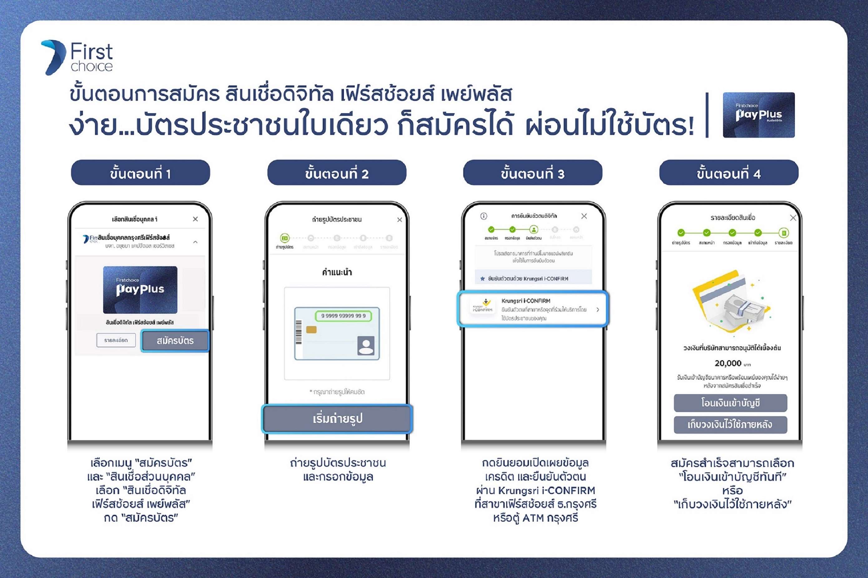 ‘สินเชื่อดิจิทัล เฟิร์สช้อยส์ เพย์พลัส’ สมัครง่ายได้ทุกที่ผ่าน UCHOOSE ไม่ต้องใช้เอกสารแสดงรายได้ ทราบผลอนุมัติไว รับวงเงินสินเชื่อสูงสุด 20,000 บาท พร้อมให้บริการสำหรับบุคคลสัญชาติไทยอายุ 20-55 ปี ที่มีรายได้ประจำ 10,000 บาท หรือมีเงินหมุนเวียนในธนาคาร 25,000 บาทขึ้นไปต่อเดือน ไม่มีประวัติผิดนัดชำระหนี้หรือมีหนี้สินคงค้าง และไม่เคยมีผลิตภัณฑ์ของกรุงศรีเฟิร์สช้อยส์มาก่อน และยินยอมให้เข้าถึงข้อมูลตามระบบการพิจารณาสินเชื่อ