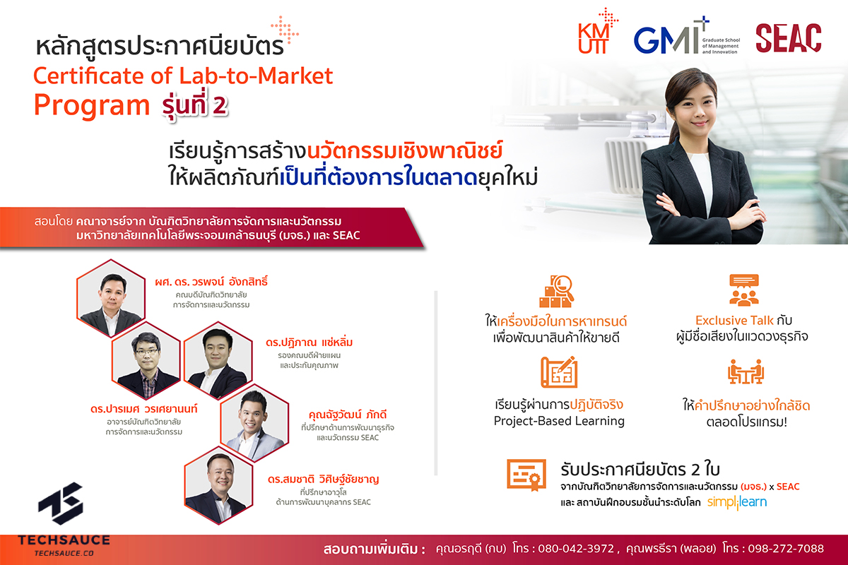 SEAC ศูนย์พัฒนาและส่งเสริมการเรียนรู้ตลอดชีวิตแห่งภูมิภาคอาเซียน ร่วมมือกับ บัณฑิตวิทยาลัยการจัดการและนวัตกรรม มหาวิทยาลัยเทคโนโลยีพระจอมเกล้าธนบุรี ร่วมกันพัฒนาหลักสูตรประกาศนียบัตร Lab-To-Market Program รุ่น 2 ผลักดันงานวิจัยสู่เวทีธุรกิจ สร้างนวัตกรรมเชิงพาณิชย์ที่ตอบโจทย์ผู้บริโภคยุคใหม่ มุ่งเสริมทักษะวิธีคิดบุคลากรด้านงานวิจัย พัฒนานวัตกรรมและผลิตภัณฑ์ ให้สามารถผนวกมุมมองธุรกิจ สร้างสรรค์นวัตกรรมที่เกิดผลเชิงพาณิชย์โดยยึดผู้บริโภคเป็นศูนย์กลางตลอดกระบวนการวิจัย เพื่อขับเคลื่อนองค์กรและผลักดันผลิตภัณฑ์นวัตกรรมที่ตอบโจทย์ผู้บริโภค ออกสู่ท้องตลาด โดยหลักสูตรประกาศนียบัตรระยะสั้นนี้ ผ่านการพิสูจน์มาแล้วจากนักวิจัย ทีมสร้างนวัตกรรม และทีมพัฒนาผลิตภัณฑ์ ที่เข้าร่วมโครงการในรุ่นก่อนหน้า จากบริษัทชั้นนำในประเทศไทยกว่า 20 องค์กร