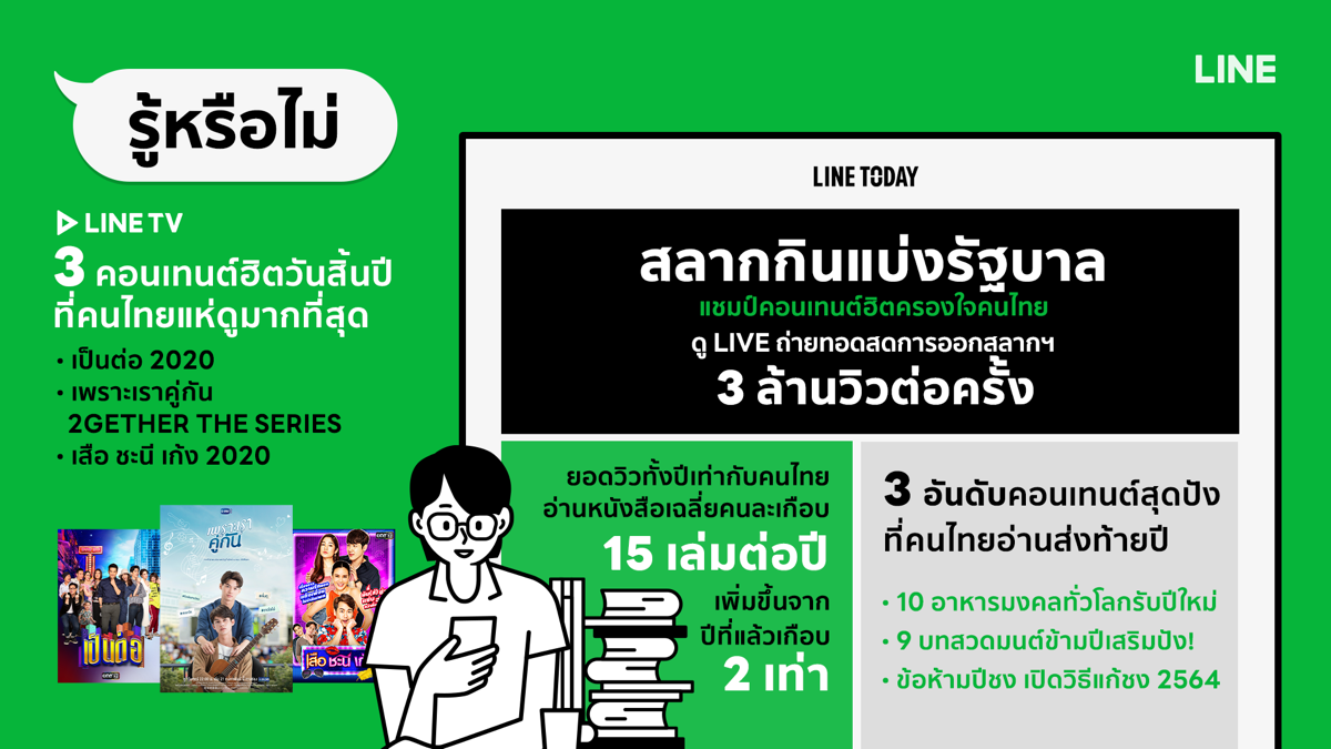 ในขณะที่ LINE Today หากมองภาพรวมในปีนี้ พบว่าคนไทยรักการอ่านมากขึ้น แต่เป็นการอ่านผ่านแพลตฟอร์มออนไลน์แทนหนังสือจริง โดยยอดวิวบน LINE TODAY รวมทั้งปีเท่ากับคนไทยอ่านหนังสือ* เฉลี่ยคนละเกือบ 15 เล่มต่อปี เพิ่มขึ้นจากปีที่แล้วถึงเกือบ 2 เท่า ในส่วนคอนเทนต์ยอดนิยมของไทย คงหนีไม่พ้นเรื่องเสี่ยงดวง โดยคอนเทนต์เกี่ยวกับสลากกินแบ่งรัฐบาล ยังคงครองแชมป์คอนเทนต์ฮิตแห่งปี ไม่ว่าจะเป็นยอดการชม LIVE ในทุกวันลอตเตอรี่ออกที่สูงแตะเกิน 3 ล้านวิวในทุกครั้ง และยอดการอ่านคอนเทนต์เกี่ยวกับผลสลากกินแบ่งฯ บน LINE TODAY ก็มีอัตราเพิ่มขึ้นถึง 50% ในช่วงวันลอตเตอรี่ออก แต่ที่น่าสนใจคือช่วงวันเคาท์ดาวน์ปีใหม่ พบว่า 3 อันดับคอนเทนต์ที่คนไทยอ่านส่งท้ายปีมากสุดในช่วง 1 ชม. ก่อนเคาท์ดาวน์ (23.00 – 23.59 น. ของวันที่ 31 ธ.ค. 63) ล้วนเป็นคอนเทนต์สายมู เสริมมงคล ไม่ว่าจะเป็น 10 อาหารมงคลที่คนทั่วโลกนิยมกินรับปีใหม่! ‘หมอช้าง’ เผย 9 บทสวดมนต์ข้ามปี 2564 เสริมปัง! และข้อห้ามปีชง เปิดวิธีแก้ชงปี 2564 สะท้อนให้เห็นพฤติกรรม ความชื่นชอบโดยเฉพาะของคนไทยในคอนเทนต์ด้านความเชื่อรับช่วงปีใหม่ ดวงเป็นอย่างไร คนไทยต้องรู้ก่อนเสมอ!(* คำนวณจากหนังสือกระดาษ A4 จำนวน 200 หน้า ขนาดตัวอักษร 14)