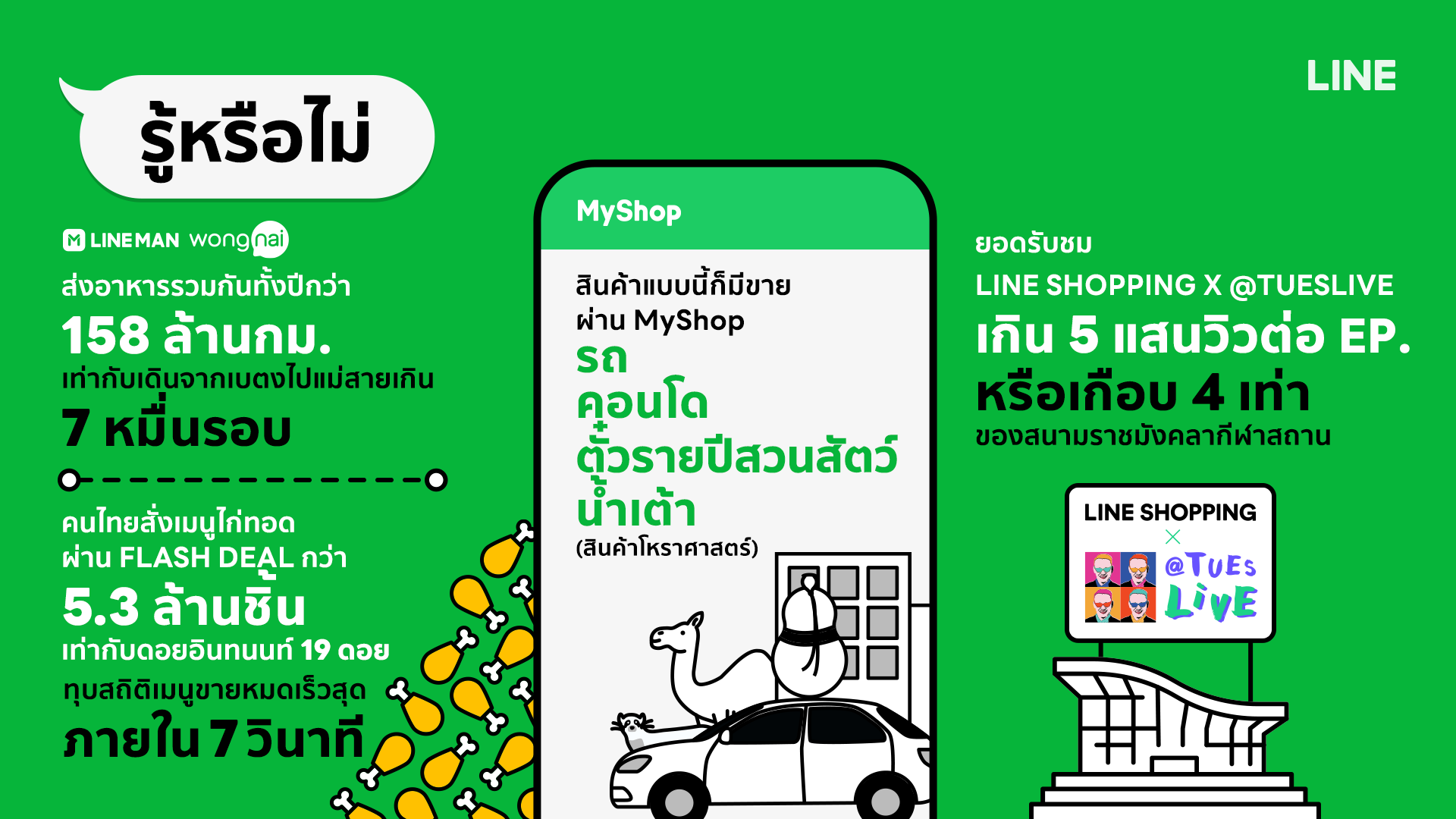 ในขณะที่พฤติกรรมการช้อปปิ้งท่ามกลางสถานการณ์ในปีที่ผ่านมา โซเชียลคอมเมิร์ซได้กลายเป็นรูปแบบการช้อปปิ้งที่มาแรง LINE จึงได้จับมือกับ “ป้าตือ” เซเลปสุดปังแห่งเมืองไทย จัดทำ LINE SHOPPING x @TuesLIve รายการไลฟ์สดขายของแนวใหม่ที่ผสานรายการวาไรตี้ ความเอนเตอร์เทนท์เข้าไว้ด้วยกัน เพื่อช่วยเหลือทั้งผู้ประกอบการและผู้บริโภคเมืองไทยให้สามารถซื้อขายของได้อย่างสนุก มีสีสันในสภาวะตึงเครียดของการแพร่ระบาด จนได้กระแสตอบรับดีเกินคาด ด้วยยอดผู้ชมเกิน 5 แสนวิวทุกตอน หรือเกือบ 4 เท่าของที่นั่งผู้ชมในสนามราชมังคลากีฬาสถานเลยทีเดียว! นอกจากนี้ เครื่องมือช่วยเปิดหน้าร้านออนไลน์อย่าง MyShop ก็ได้รับความนิยม ช่วยเหลือพ่อค้าแม่ค้าคนไทยหลายรายให้สามารถสร้างร้านขายของออนไลน์เองได้แม้ในยามลำบาก ก่อให้เกิดสินค้าใหม่ๆ มากมายที่ในสถานการณ์ปกติไม่ขายผ่านช่องทางออนไลน์กันมาก่อน อาทิ คอนโด รถยนต์ หรือแม้กระทั่งน้ำเต้าศักดิ์สิทธิ์ และตั๋วรายปีสวนสัตว์ เป็นต้น สะท้อนให้เห็นถึงพฤติกรรมการปรับตัวของผู้ประกอบการไทย ที่หันมาเปิดช่องทางออนไลน์ผ่าน MyShop บนแพลตฟอร์ม LINE เพื่อเข้าถึงลูกค้าได้ในทุกสถานการณ์