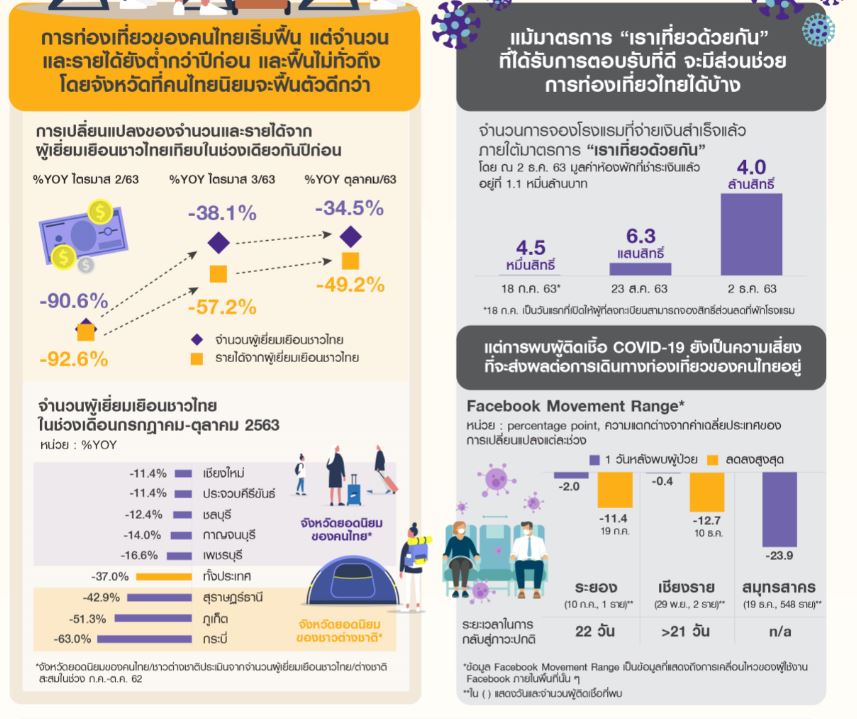 ภาคการท่องเที่ยวของไทยในช่วงที่ผ่านมามีการทยอยฟื้นตัวจากการท่องเที่ยวของคนไทยด้วยกันเอง แต่ทั้งจำนวนและรายได้ก็ยังคงอยู่ในระดับต่ำกว่าปีก่อนหน้า ขณะที่การฟื้นตัวในช่วงที่ผ่านมายังไม่ทั่วถึง โดยจังหวัดที่คนไทยนิยมท่องเที่ยวอยู่แล้วในอดีตยังเป็นกลุ่มที่สามารถฟื้นตัวได้ดีกว่า